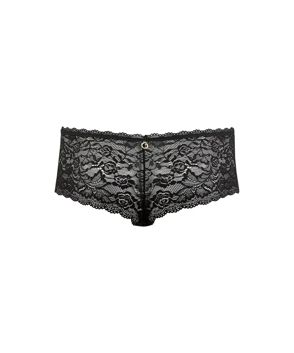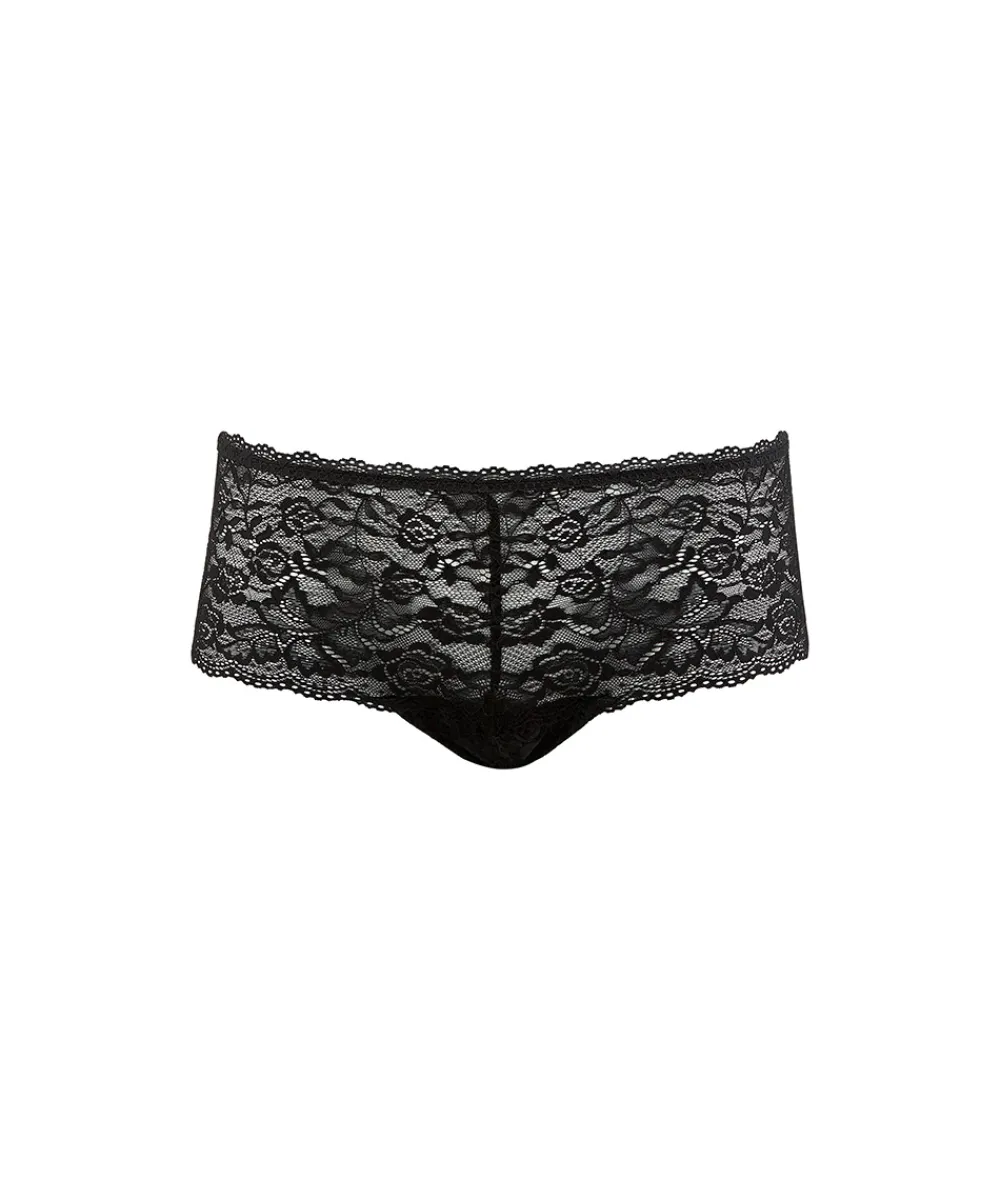 Elegant hipstertrusse dekoreret med smuk blonde. Trussemodellerne hipster og shorts har en vandret benudskæring. Hipstertrussen går lidt op på balden og tegner et vandret snit mens shortsene dækker hele balden. Særligt populære er hipstermodellerne med fine franske blonder, som tegner et smukt mønster hen over balderne og de mange sømløse og laserskårne hipstertrusser og shorts, som ikke ses under tætsiddende tøj. Materiale: bund blonde: 85% polyamid, 15% elastan; top blonde: 82% polyamid, 18% elastan; skridtkile: 100% bomuld.