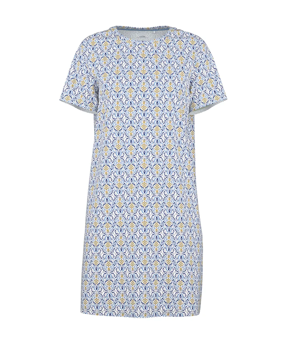 Komfortabel, kort natkjole med t-shirt ærmer fra Calida. Natkjolen er designet med et skønt print. Natkjolen er lavet i en blød bomuld. Vær obs på størrelsesguide. Materiale: 100% bomuld.