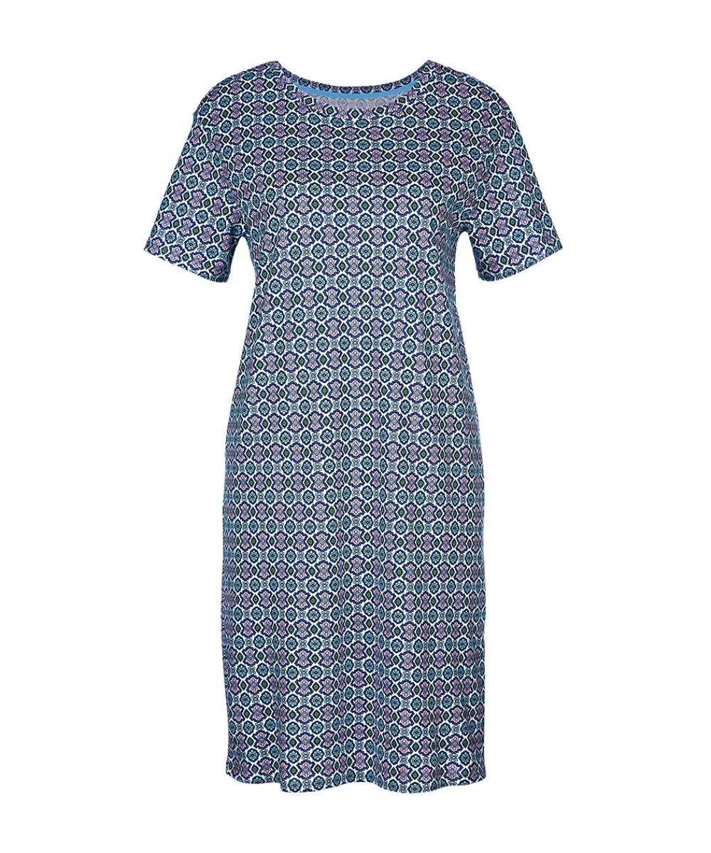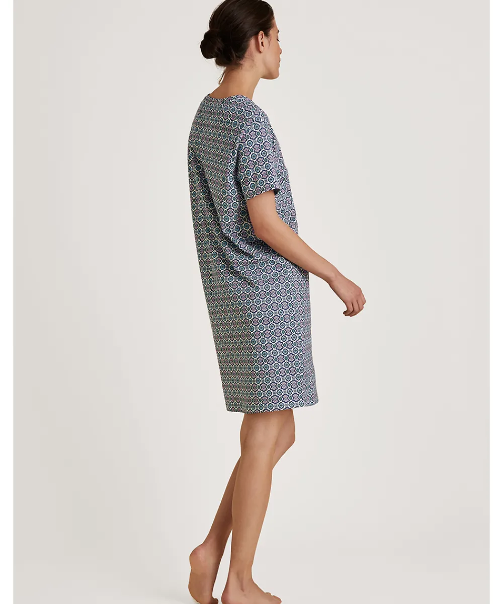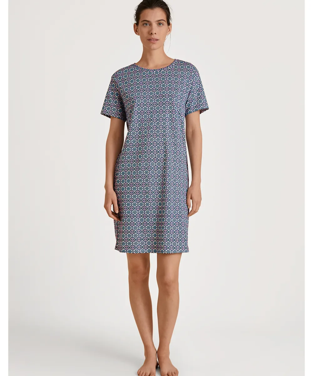 Komfortabel, knælang natkjole med t-shirt ærmer fra Calida. Natkjolen er designet med et skønt print. Natkjolen er lavet i en blød bomuld. Vær obs på størrelsesguide. Materiale: 100% bomuld.
