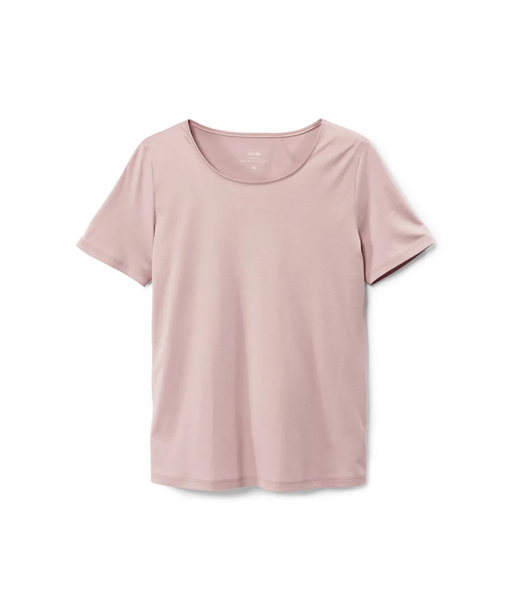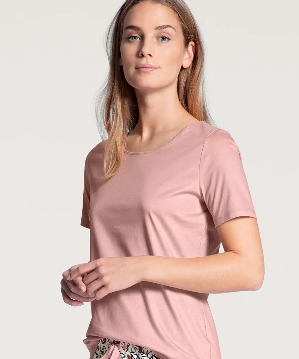 Feminin t-shirt med rund hals, korte ærmer og en løs pasform. Brug t-shirten til et par lækre natbukser fra Calida. Vær obs på størrelsesguide. Materiale: 100% bomuld.