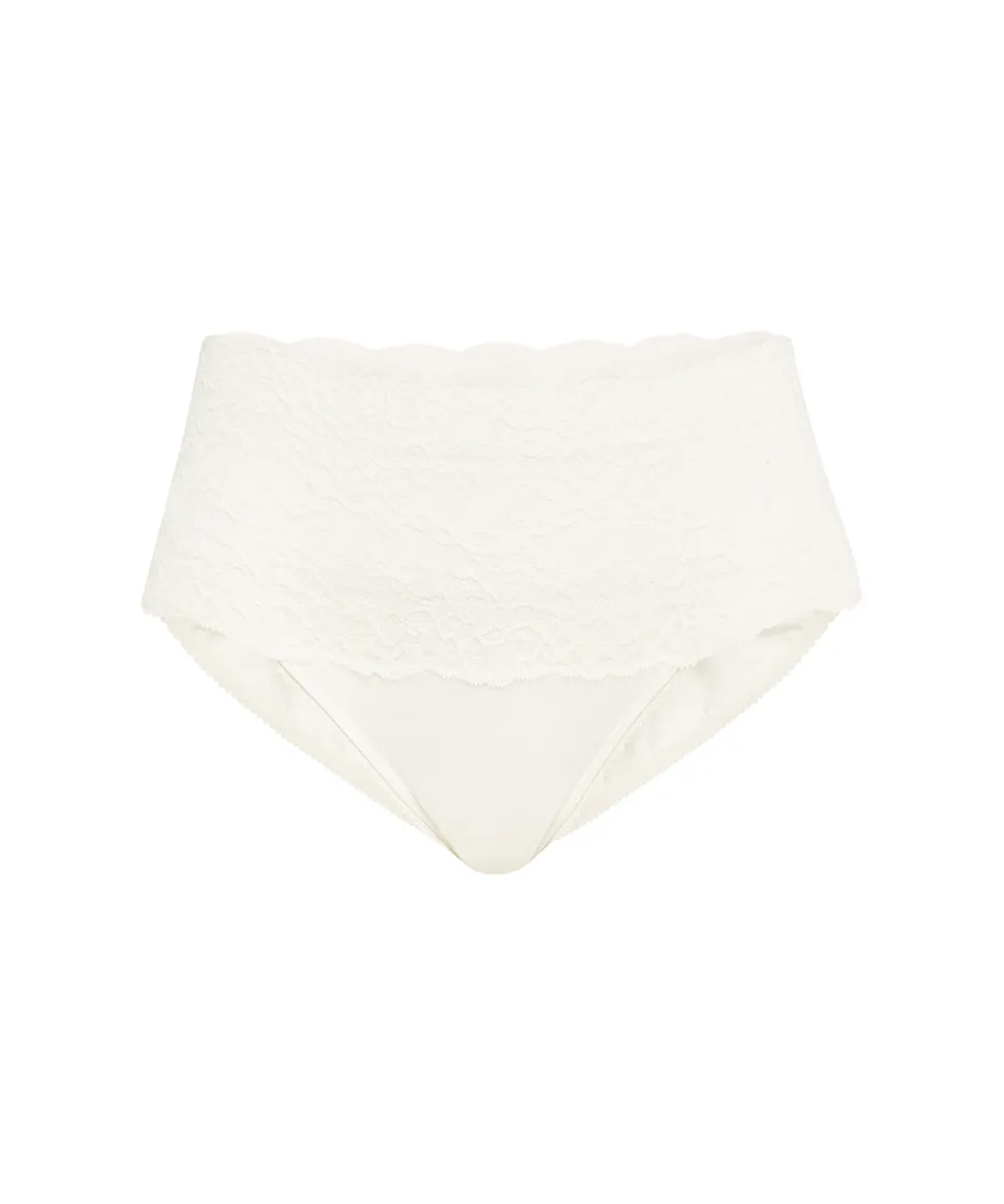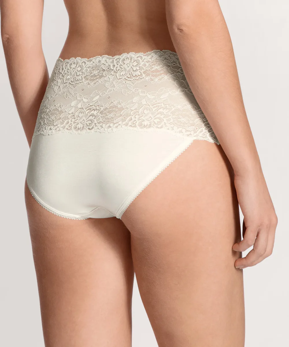 Elegant taitrusse med høj og fin blondelinning. Maxitrussen er en højtaljet trusse med bredt sidestykke og lavt bensnit. Maxitrussen dækker den nederste del af maven og passer derfor godt til tøj, der går op i taljen. Vær obs på størrelsesguide. Materiale: 57% viskose, 38% bomuld, 5% elastan.