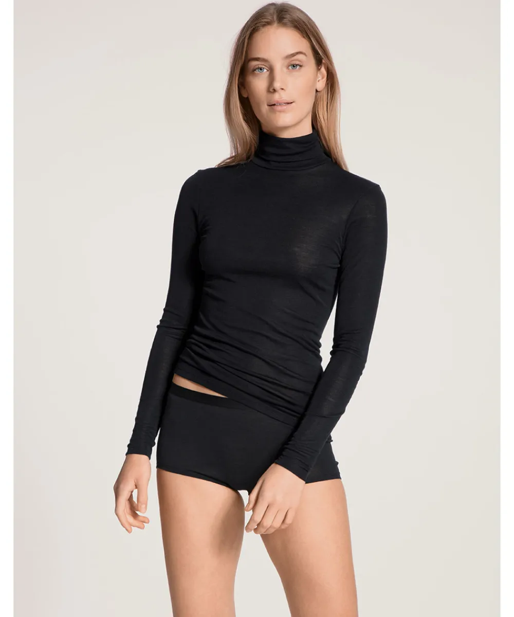 Komfortabel hipstertrusse med høj talje. Trussen er lavet i en kombination af uld og silke. Kvaliteten køler på varme dage og varmer på kolde dage.Vær obs på størrelsesguide. Materiale: 70% jomfru uld, 30% silke