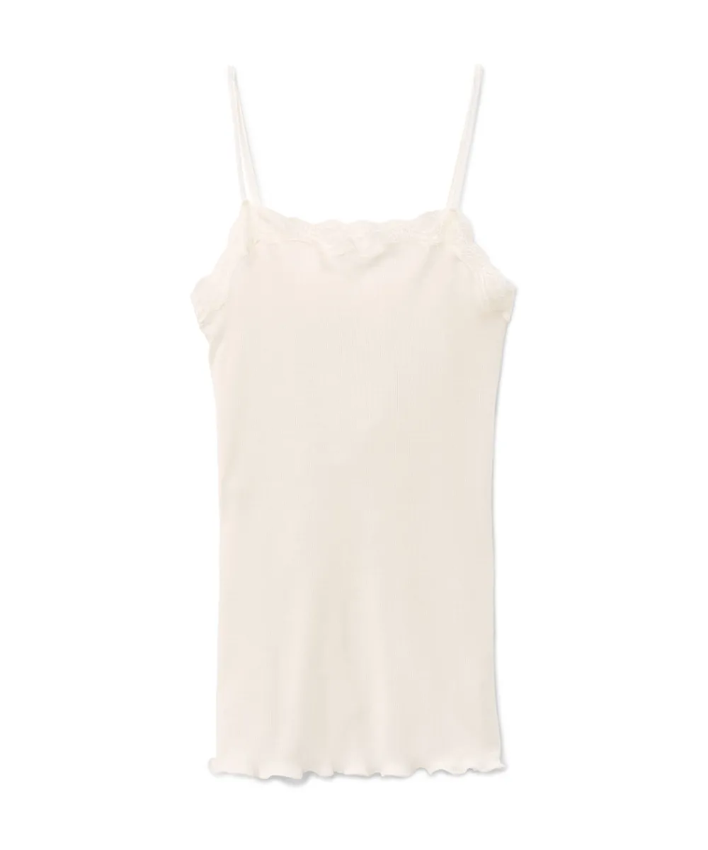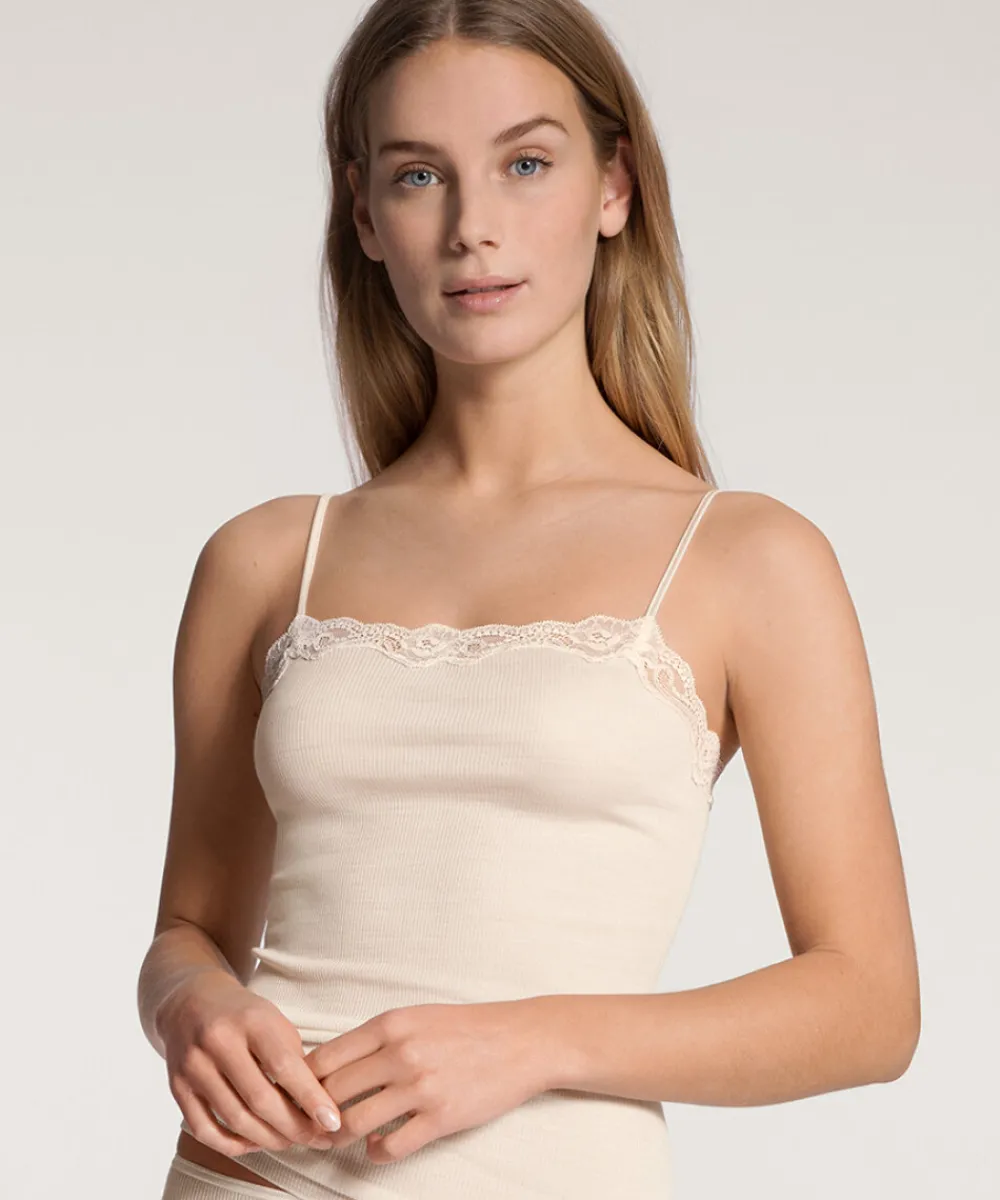 Enkel top med justerbare spaghettistropper og blondekant.Vær obs. på størrelsesguide. Materiale: 70% jomfruuld, 30% silke
