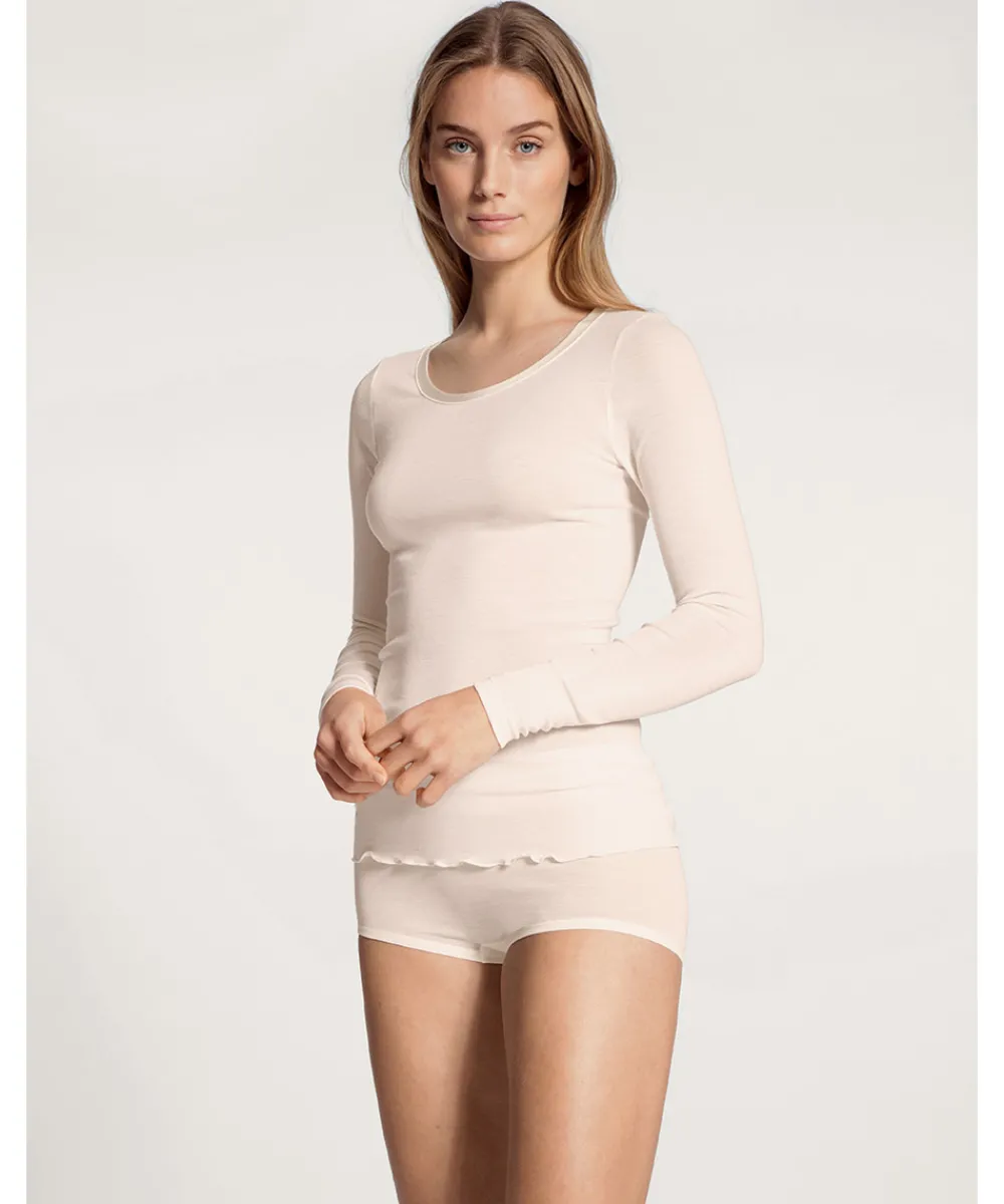 Basis top fra Calida med lange ærmer. Toppen er lavet i en kombination af uld og silke. Kvaliteten køler på varme dage og varmer på kolde dage. Vær obs på størrelsesguide. Materiale: 70% jomfru uld, 30% silke.