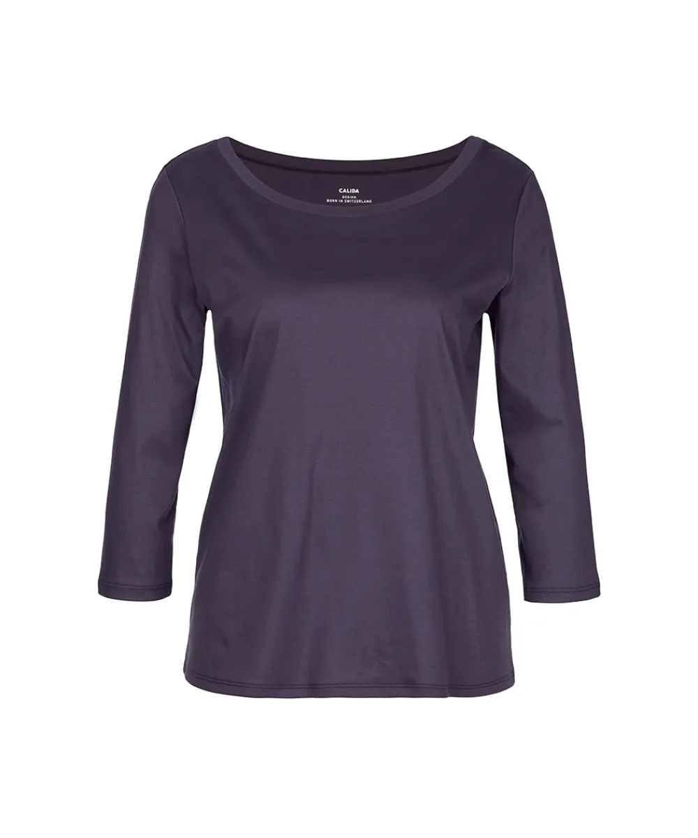 Feminin t-shirt med rund hals, 3/4 lange ærmer og en løs pasform. T-shirten er lavet i en blød bomuld. Mix t-shirten med din ynglings natbuks fra Calida. Vær obs på størrelsesguide. Materiale: 100% bomuld.