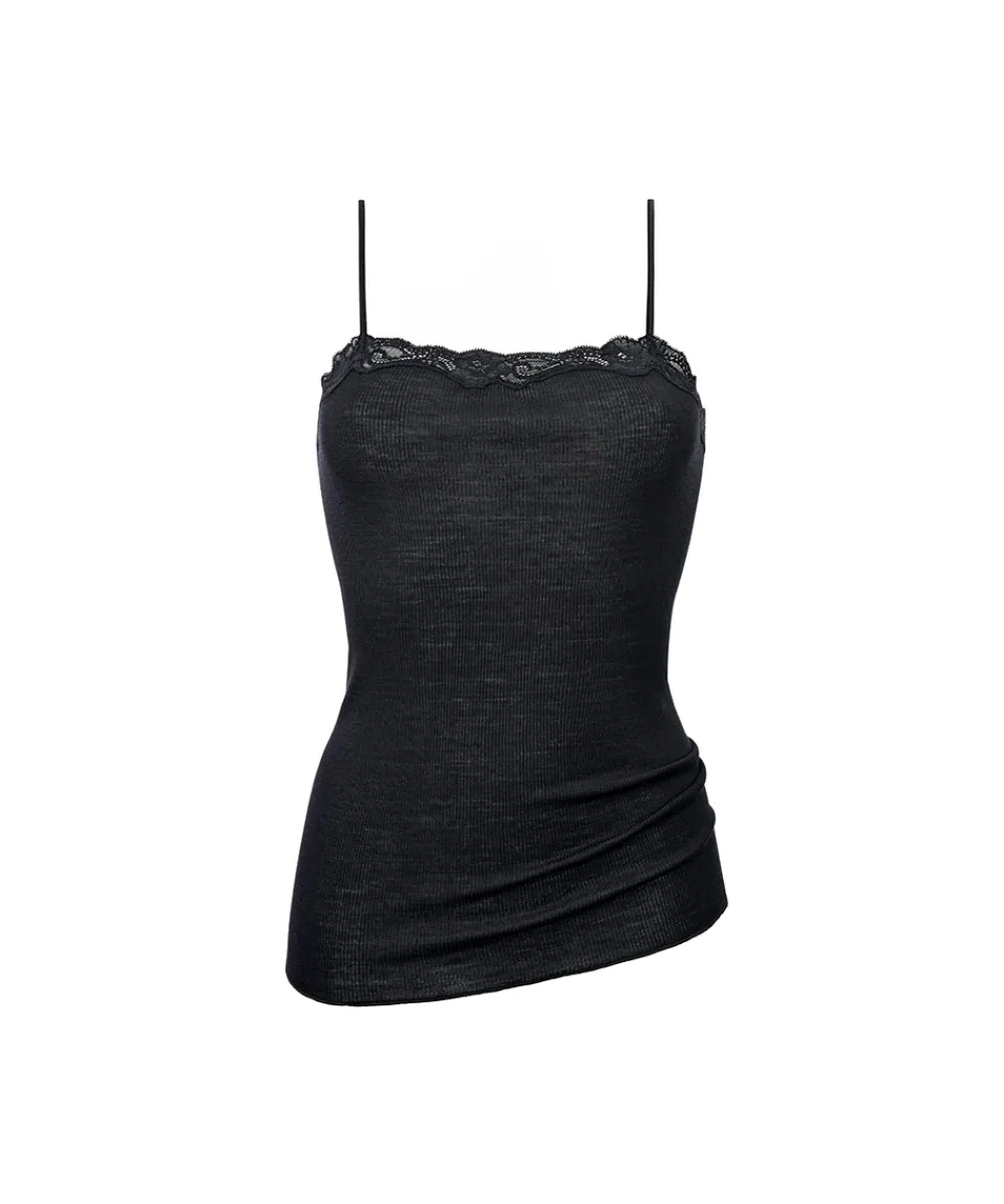 Enkel top med justerbare spaghettistropper og blondekant. Vær obs. på størrelsesguide. Materiale: 70% jomfruuld, 30% silke