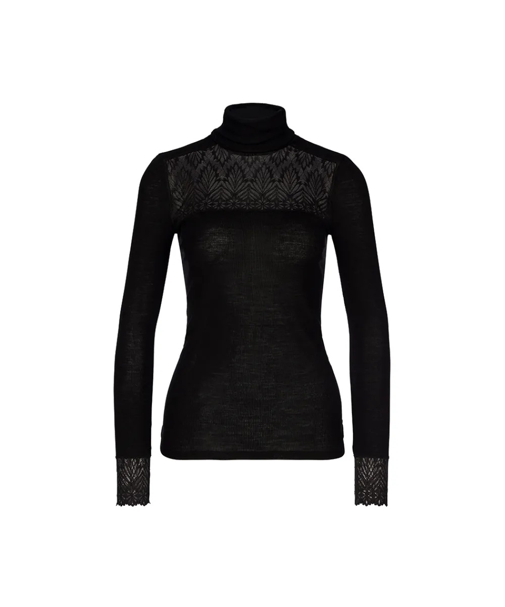 Højhalset bluse med blonder og lange ærmer. Blusen er lavet i fin, uld og silke. Produkter der indeholder en kombination af uld og silke vil den få den egenskab, at det bliver temperatur-regulerende. Det betyder, at det kan varme på kolde dage og køle på varme dage. Vær obs på størrelsesguide. Materiale: 70% jomfruuld, 30% silke