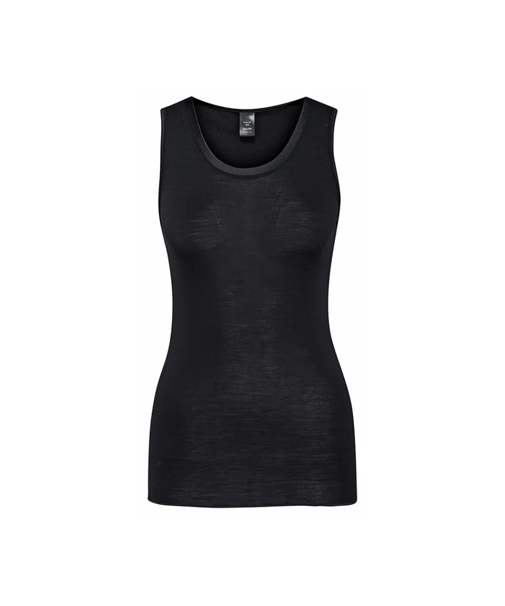 Basis top med brede stropper. Toppen er lavet i en kombination af uld og silke. Kvaliteten køler på varme dage og varmer på kolde dage. Vær obs på størrelsesguide. Materiale: 70% jomfru uld, 30% silke.