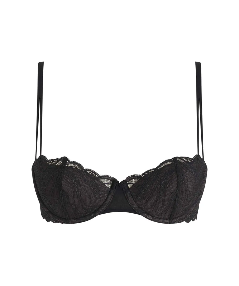 Calvin Klein balconette bh med en flot all-over blonde. Halvskålsbh’er kaldes ofte balconetter. Balconette bh’er har et vandret snit på skålene og dækker halvdelen af barmen. Stropperne er placeret yderst ude på skuldrene, og balconettebh’en er derfor perfekt til toppe med dybe/ vide udskæringer. Har du fylde øverst på barmen, kan du både bruge de rene blondebalconetter og de vatterede modeller. Har du derimod meget lidt fylde øverst på barmen, bør du gå efter en balconettebh med vatterede skåle eller lodrette sømme, som runder barmen. Materiale: polyamid 85%, elastan 15%