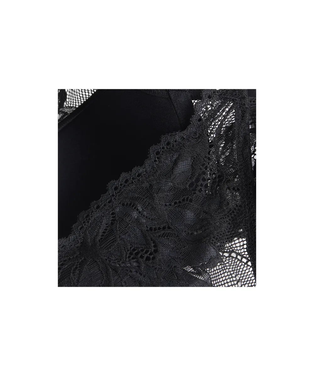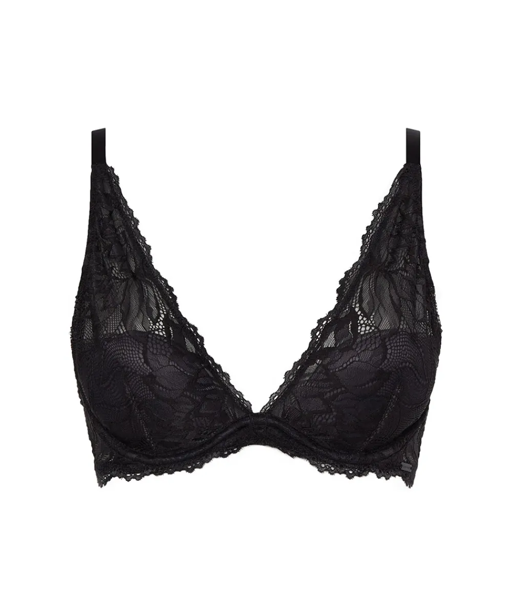 Calvin Klein trekantsbh med flad bøjle. Bh’en er dekoreret i en yndig all-over blonde. Denne model har et lavt midterstykker, og samler derfor barmen i en flot dekolletage. Trekantsbh’er er er skåret skråt og tegner dermed et v-snit for til på barmen. Fordi trekantsbh’en løber skråt over barmen, kan modellen være god til kvinder med mindre fylde øverst på barmen – den skrå linje lukker skålen for oven, så den ikke så let gaber. Materiale: polyamid 86%, elastan 14%.