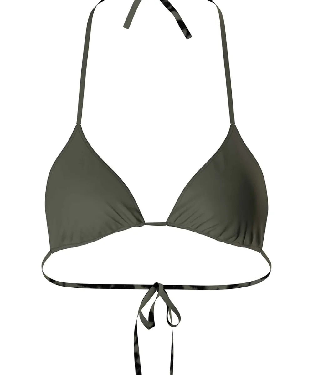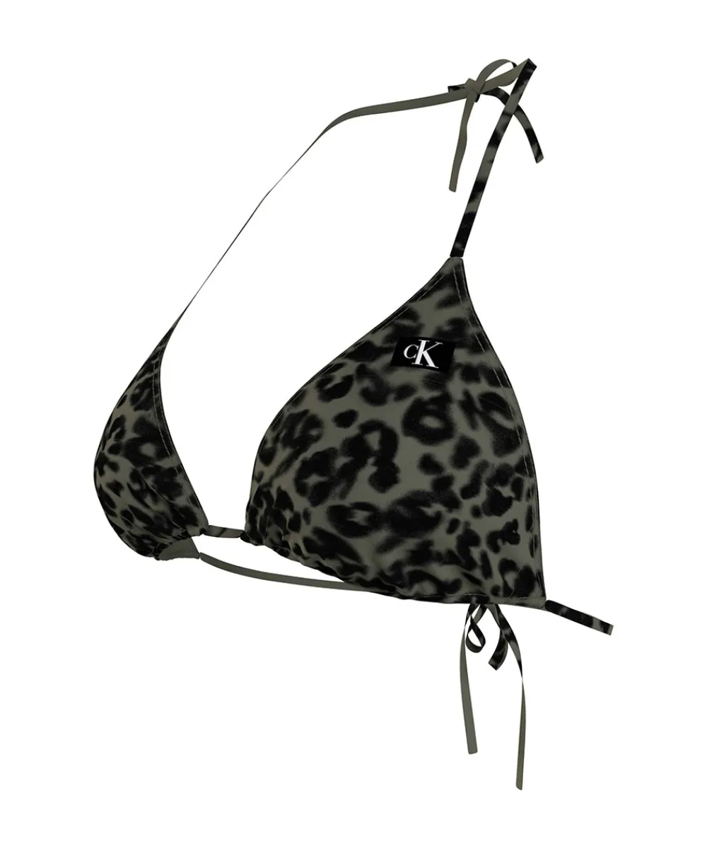 Calvin Klein bikinitop i dyreprint med bindebånd. Bikinitoppen har let vatteret skåle. Badetøj skal gerne sidde stramt, da det udvider sig ved brug i vand. Husk altid at skylle badetøjet op i koldt vand efter brug. Materiale: genanvendt polyester 85%, elastan 15%