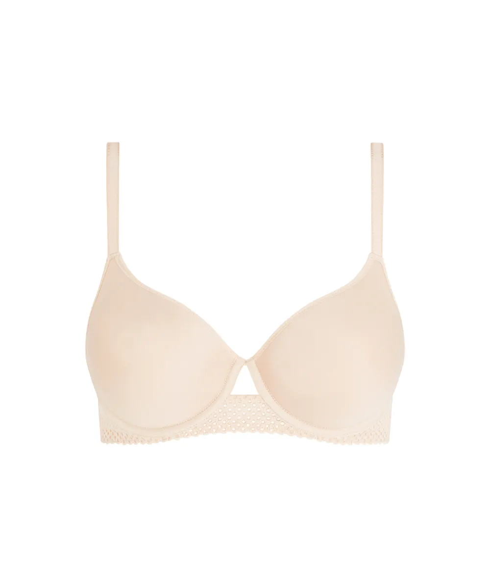 T-shirt bh fra Chantelle Pulp. Bh’en har utrolig bløde stropper og sidestykker, hvilket gør den meget behagelig at bære. God støtte og høj komfort med skåle i “memory foam”, der former sig efter barmen. Trekvartskålsbh’en er god under tætsiddende tøj, da den har glatte skåle. Materiale: 83% nylon, 17% elastan.