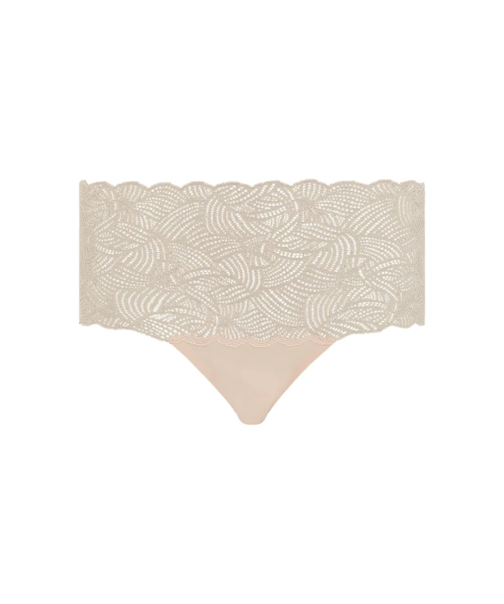 Komfortabel basis højtaljet taitrusse med bred blonde. Designet i et blødt, lækkert og strækbart materiale. Trussen tilpasser sig kroppens facon og størrelse. Trussen er sømløs og ideel under tætsiddende tøj. Trussen er onesize og passer ca. en størrelse 36-42. Materiale: strik udvendig; 80% nylon 20% elastan strik skridtkile; 100% bomuld.