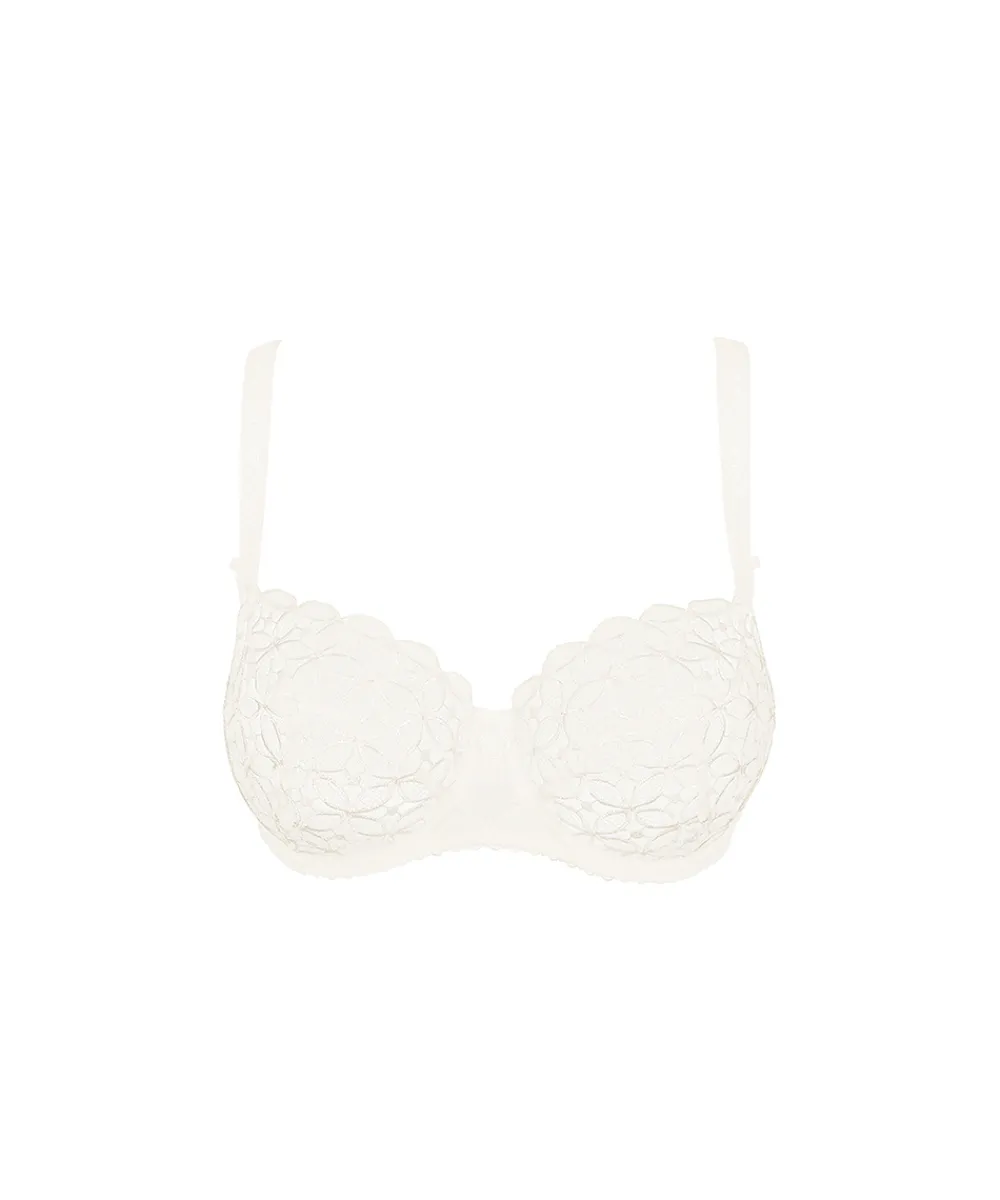 Charmerende og romantisk balconettebh. Bh’en er dekoreret sarte blonder og har brede stropper. Halvskålsbh’er kaldes ofte balconetter. Balconette bh’er har et vandret snit på skålene og dækker halvdelen af barmen. Stropperne er placeret yderst ude på skuldrene, og balconettebh’en er derfor perfekt til toppe med dybe/ vide udskæringer. Har du fylde øverst på barmen, kan du både bruge de rene blondebalconetter og de vatterede modeller. Har du derimod meget lidt fylde øverst på barmen, bør du gå efter en balconettebh med vatterede skåle eller lodrette sømme, som runder barmen. Materiale: 50% polyamid, 36% polyester, 14% elastan.