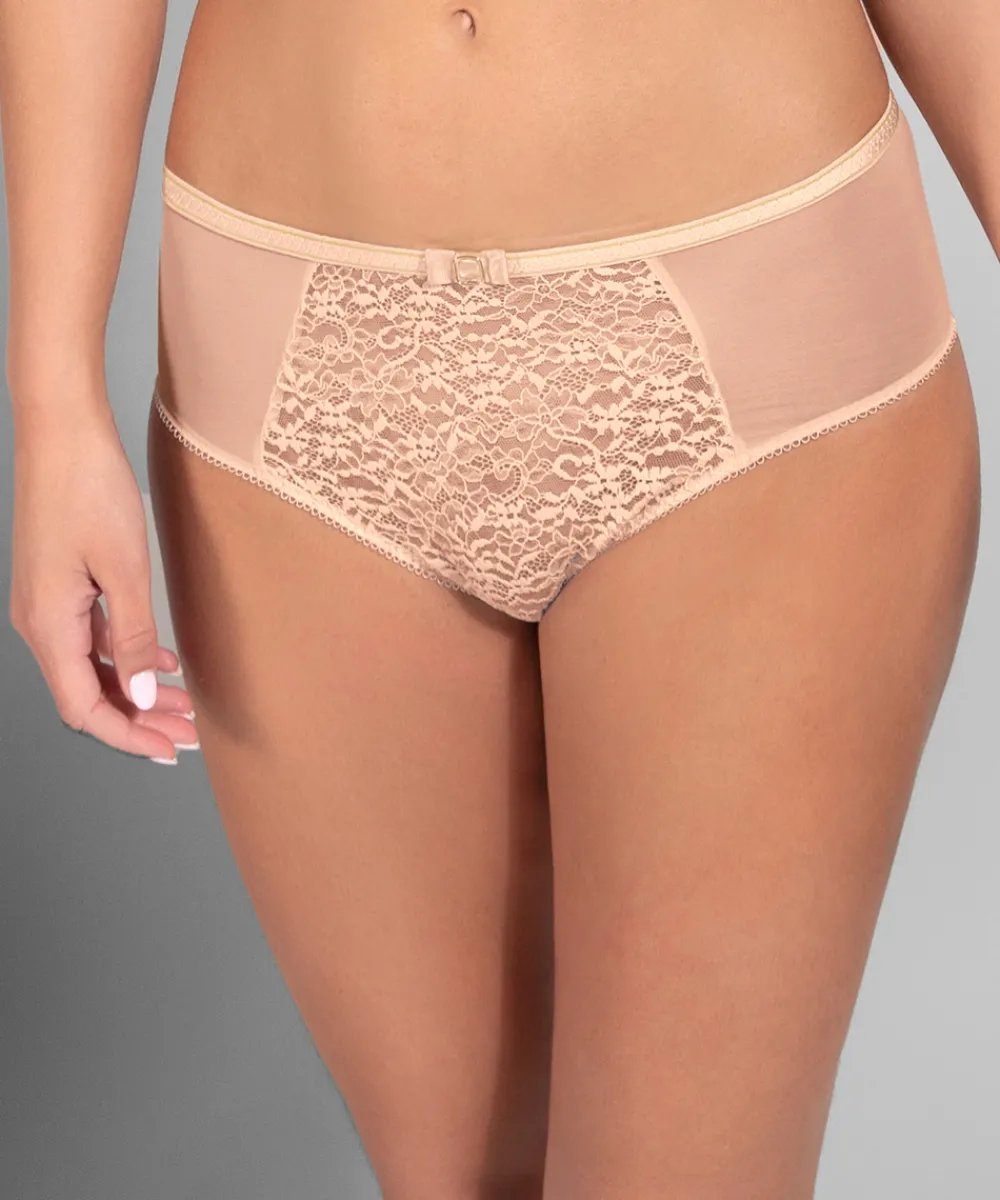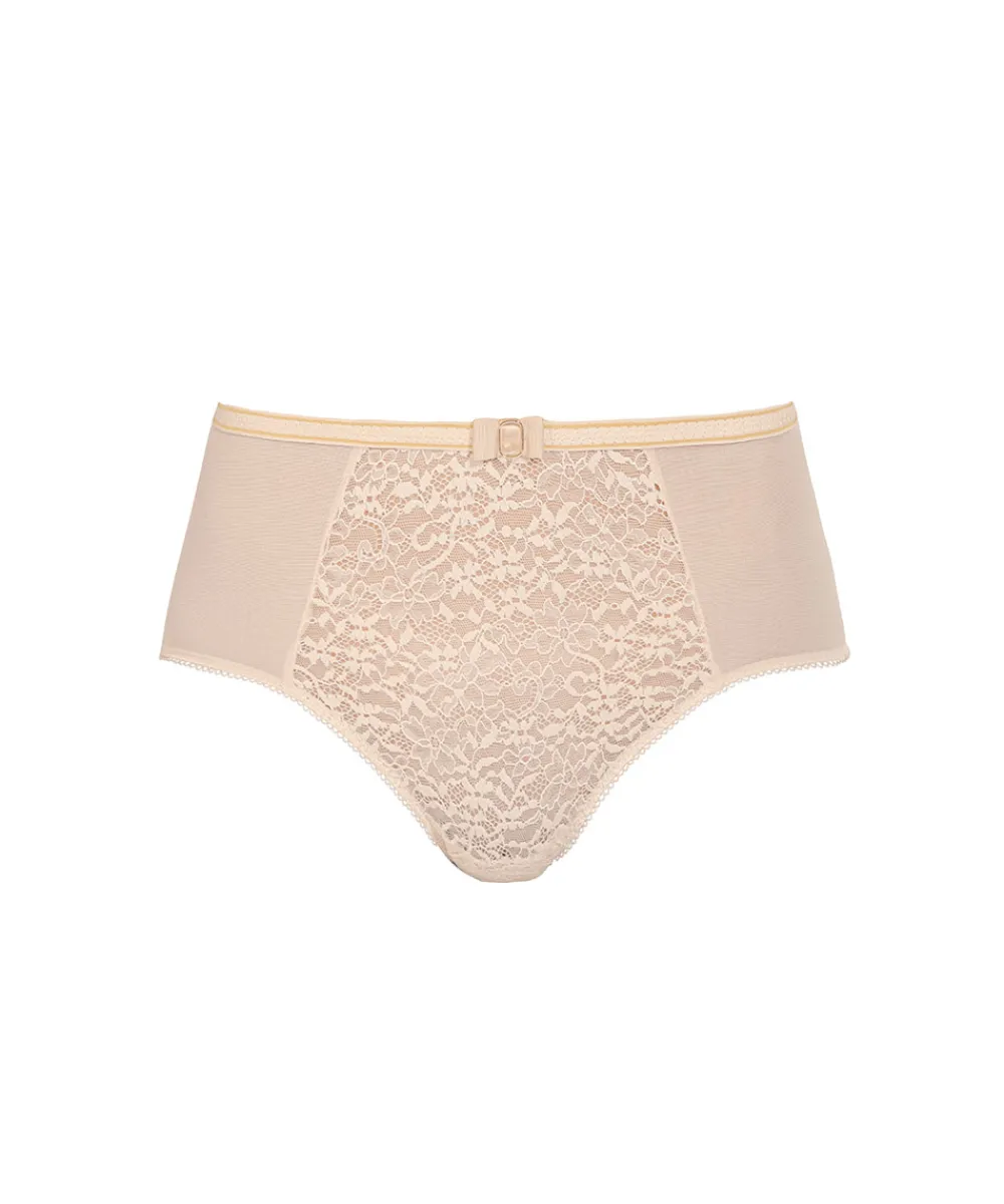 Feminin højtaljet taitrusse fra Empreinte, som er designet i en yndig blonde. Taitrussen er den bedstsolgte og mest almindelige trussetype. Taitrussen har som regel et skråt snit bagpå og dækker det meste af balderne. Et højt bensnit fortil og et smalt sidestykke får benene til at syne længere – altså er modellen god til dig, der gerne vil fremhæve ben og tilføre optisk længde. Maxitrussen er en højtaljet trusse med bredt sidestykke og lavt bensnit. Maxitrussen dækker den nederste del af maven og passer derfor godt til tøj, der går op i taljen. Materiale: 49% polyamid, 19% elastan, 16% bomuld, 16% polyester.