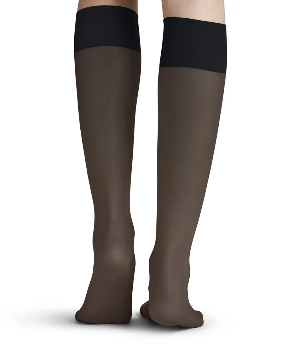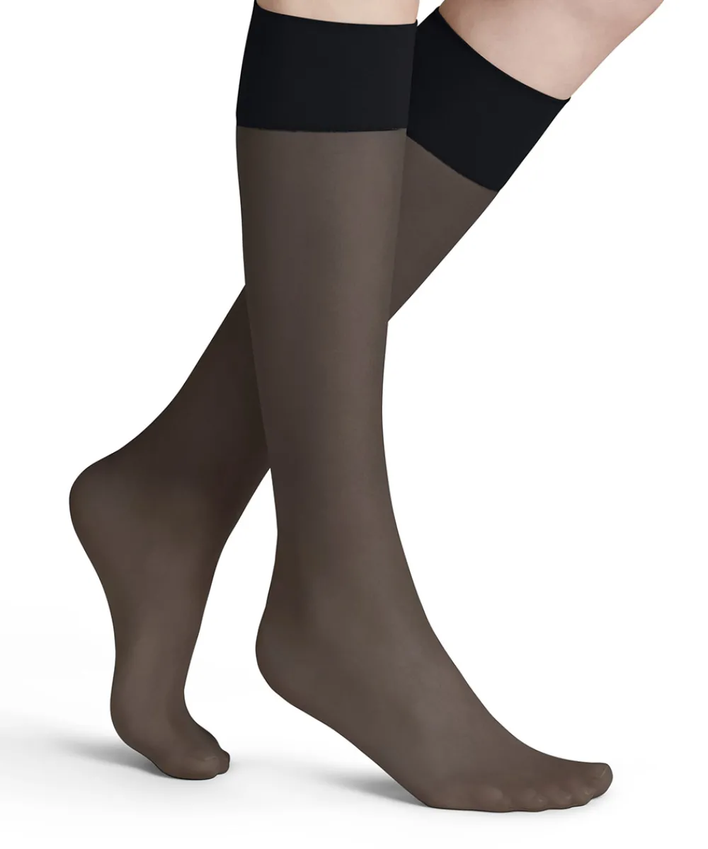 Tynd og let knæstrømpe i 20 denier med silikone i kantbåndet, der modvirker strømpen i at glide ned. Strømpen har en mat overflade, der giver et elegant look. Behagelig strømpe med ekstra bløde og sensitive kantbånd. Strømpen har forstærkede tåsektioner, der gør den mere slidstærk. Materiale: 89% polyamid, 11% elastan.