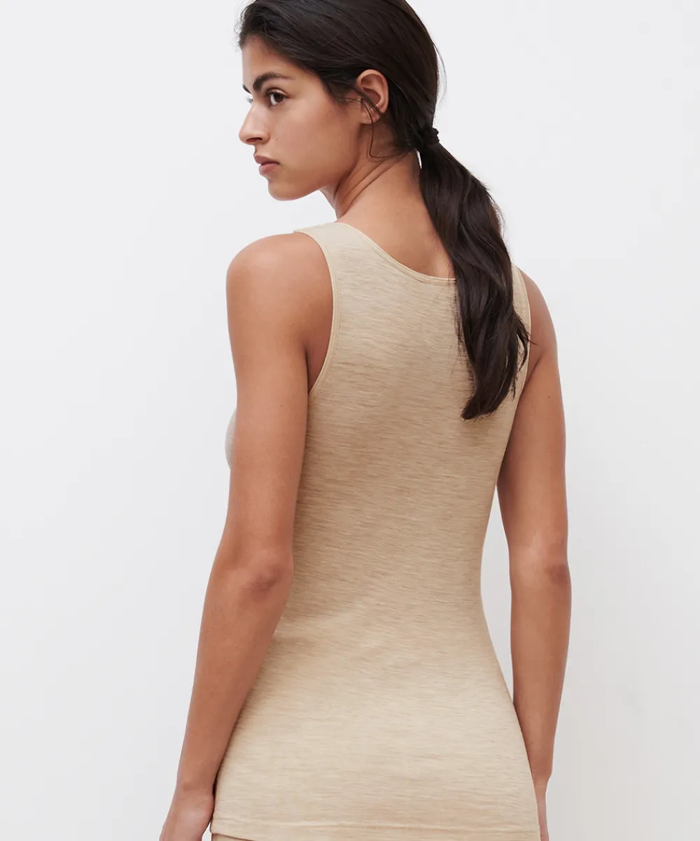 Fin undertrøje /t-shirt i uld fra Femilet med brede stropper og høj U-udskæring på ryggen. Ydermere er toppen udsmykket med den elegante meshkant, som understøtter det moderne look. Uld kan absorbere op til 35% fugt uden at det føles fugtigt at bære og isolerer helt fantastisk. Det er derfor perfekt at iføre sig i de kolde vintermåneder enten i form af nattøj eller undertøj. Produkter der indeholder en kombination af uld og silke vil den få den egenskab, at det bliver temperatur-regulerende. Det betyder, at det kan varme på kolde dage og køle på varme dage. Det er vigtigt at følge vaskeanvisningerne for uldprodukter og at anvende vaskemiddel beregnet til uld. Du kan med fordel lufte dine uldprodukter i stedet for at vaske på det, da uld er selvrensende. Materiale: 100% merinould