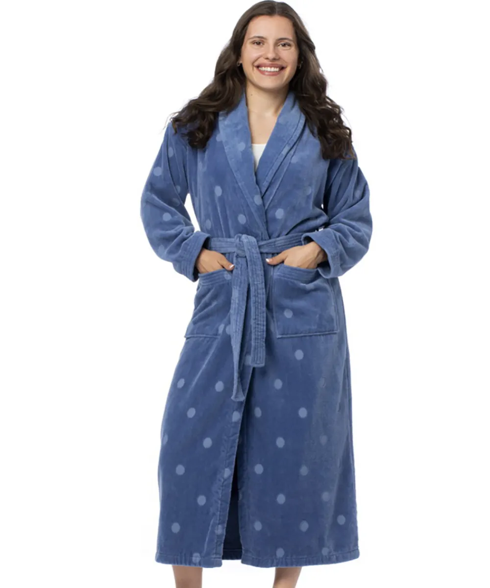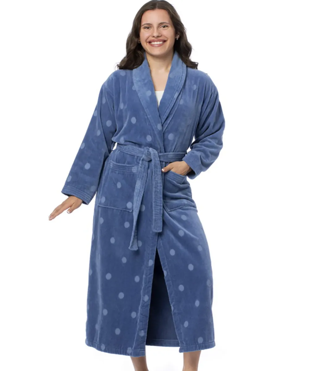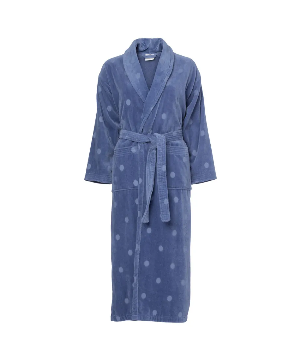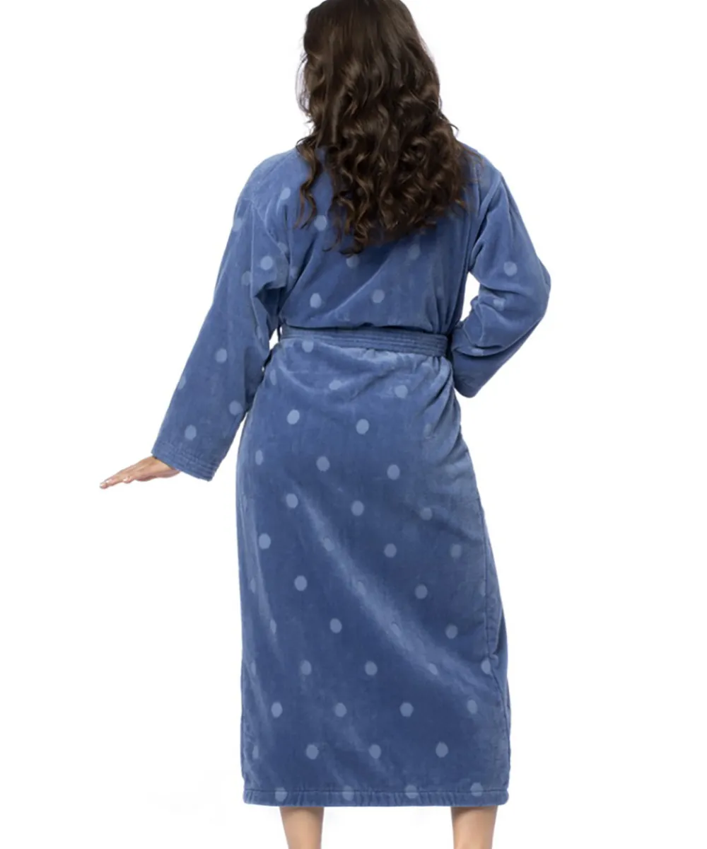 Skøn og blød lang frotte kåbe fra JBA kåber med prikker. Morgenkåben er designet med lange ærmer, har 2 lommer og bælte. Kåben er lavet i frotte, der suger vand ligesom et håndklæde. Kåber er god til blandt andet vinterbadning, ved poolen og stranden. Materiale: 45% bomuld, 55% polyester.