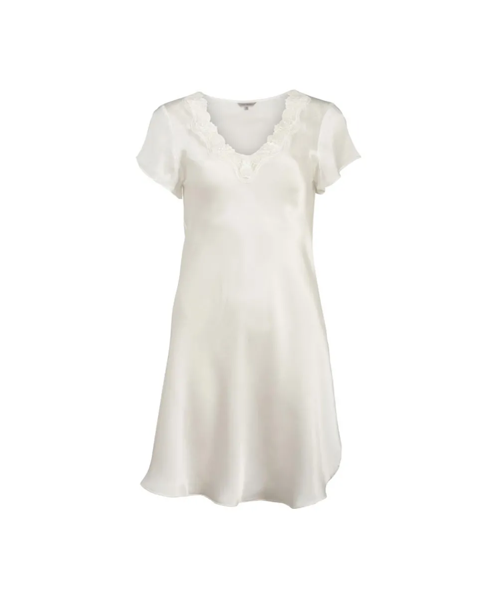Kort silke natkjole med vingeærmer og blonde i dekolletagen. Natkjolen er lavet i 100% vævet silke / silkesatin. Materiale: 100% silke.