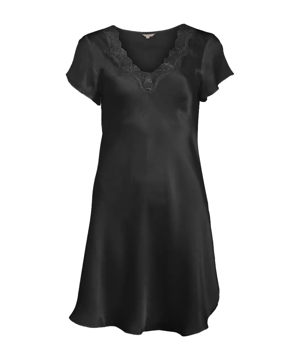 Yndig kort silke natkjole med vingeærmer og blonde i dekolletagen. Natkjolen er lavet i 100% vævet silke / silkesatin. Materiale: 100% silke.