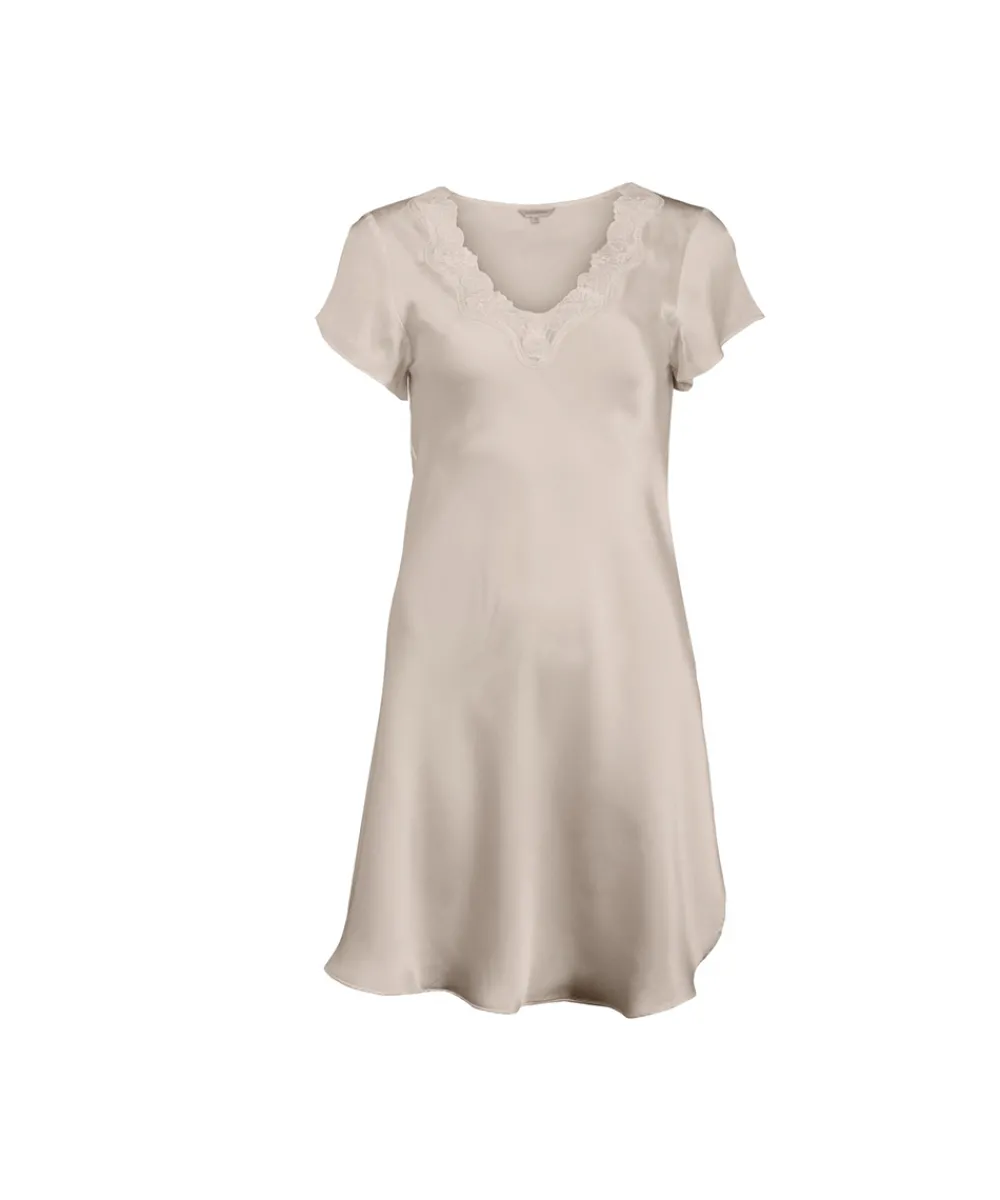 Yndig kort silke natkjole fra Lady Avenue med vingeærmer og blonde i dekolletagen. Natkjolen er lavet i 100% vævet silke / silkesatin. Silke er temperatur-regulerende, hvilket betyder at silke varmer på kolde dage og køler på varme dage. Så du kan med fordel købe nattøj eller homewear i naturlig silke, da du kan iføre dig det året rundt.Materiale: 100% silke.