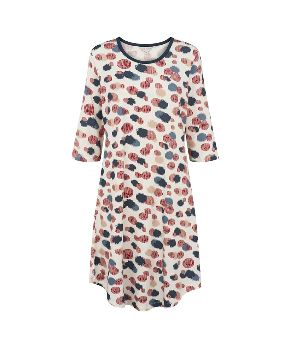 Behagelig lang bambus natkjole fra Lady Avenue med 3/4 ærmer. Natkjolen er designet med prikker, afrundet bund for bedre form og feminint look. Natkjolen har en løs pasform og meget behagelig at have på. En af de største fordele ved tøj lavet af bambusfibre er de antibakterielle egenskaber, som betyder at tøjet er særligt velegnet til sensitiv hud og allergikere. Nattøj lavet af bambus føles køligere, når det er varmt og omvendt. Materiale: 65% bambus, 28% bomuld, 7% elastan
