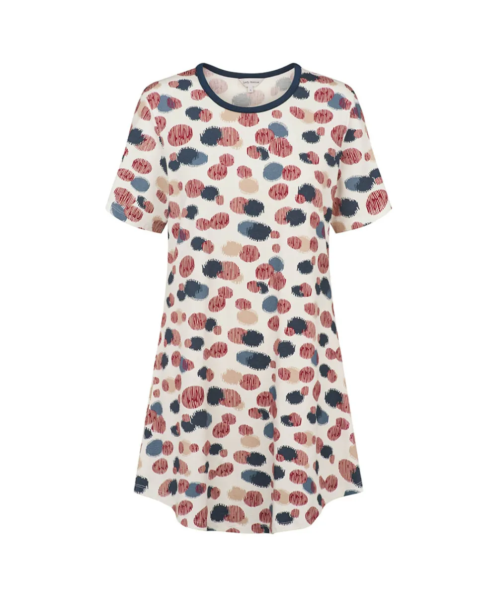 Behagelig bambus natkjole fra Lady Avenue med korte ærmer. Natkjolen er designet med prikker, afrundet bund for bedre form og feminint look. Natkjolen har en løs pasform og meget behagelig at have på. En af de største fordele ved tøj lavet af bambusfibre er de antibakterielle egenskaber, som betyder at tøjet er særligt velegnet til sensitiv hud og allergikere. Nattøj lavet af bambus føles køligere, når det er varmt og omvendt. Materiale: 65% bambus, 28% bomuld, 7% elastan
