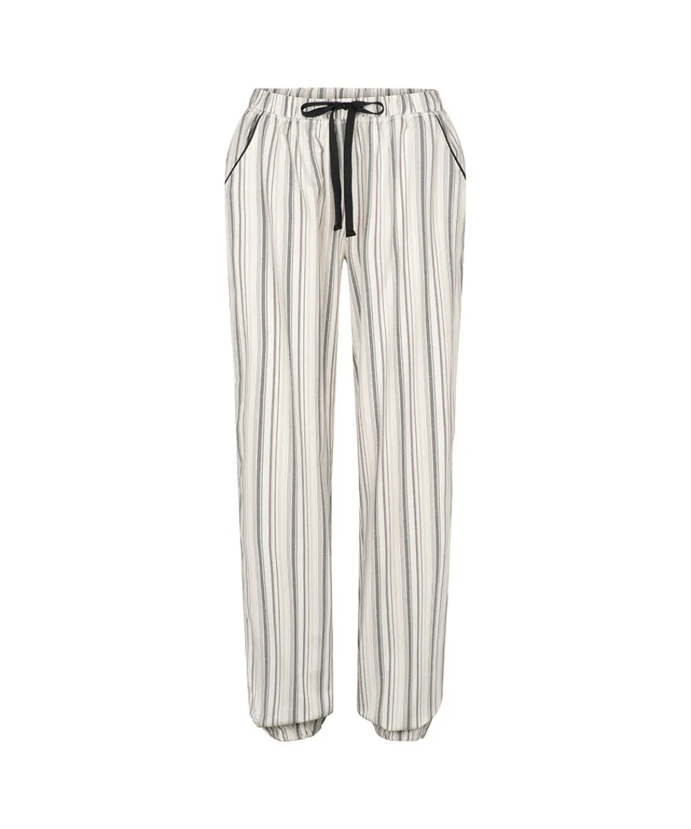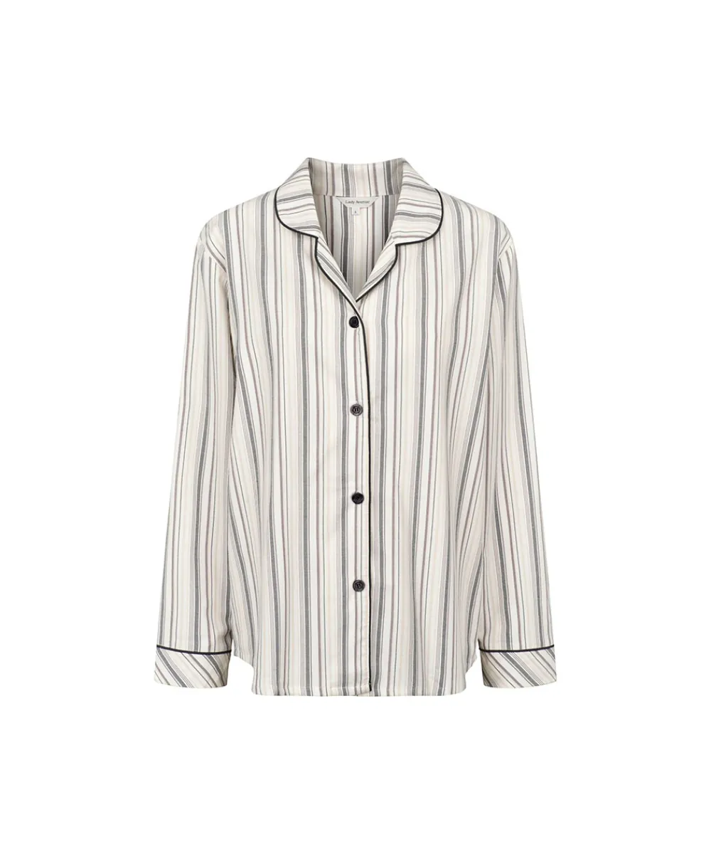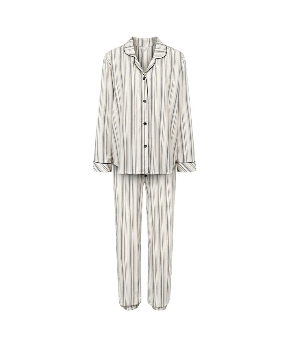 Stribet pyjamassæt fra Lady Avenue med skjorte og buks i bambus og flannel bomuld. Pyjamassen er blød og behagelig at have på. Skjorten lukkes med knapper foran, og buksen har snører i livet. Materiale: 50% bambus, 50% bomuld.