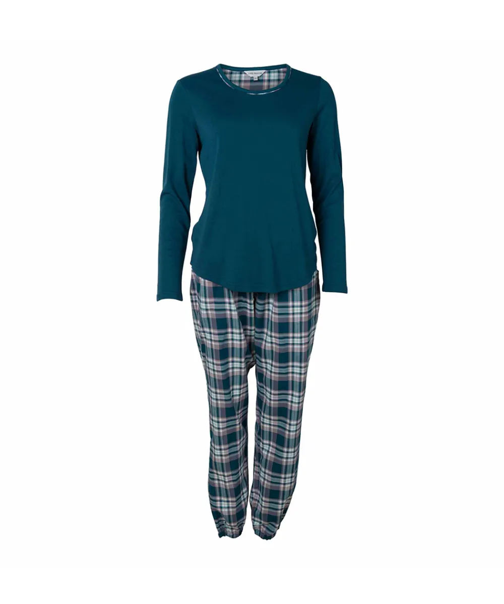 Pyjamas lavet i blødt bomuld med en afslappet pasform. Pyjamassen er todelt med en ensfarvet pyjamasbluse og ternet bukser med snørelukning i taljen. Materiale: 100% bomuld.