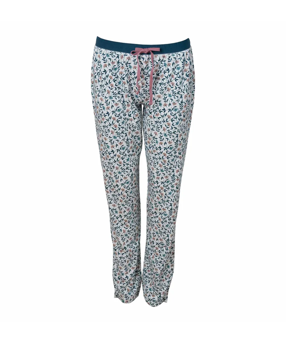Pyjamas lavet i blødt bambusmateriale. Pyjamastrøjen er med lange ærmer og et løst fit. Pyjamasbukser er designet med bånd i taljen, blød elastik ved anklen og et yndigt blomsterprint. En af de største fordele ved tøj lavet af bambusfibre er de antibakterielle egenskaber, som betyder at tøjet er særligt velegnet til sensitiv hud og allergikere. Nattøj lavet af bambus føles køligere, når det er varmt og omvendt. Materiale: 65% bambus, 28% bomuld, 7% elastan
