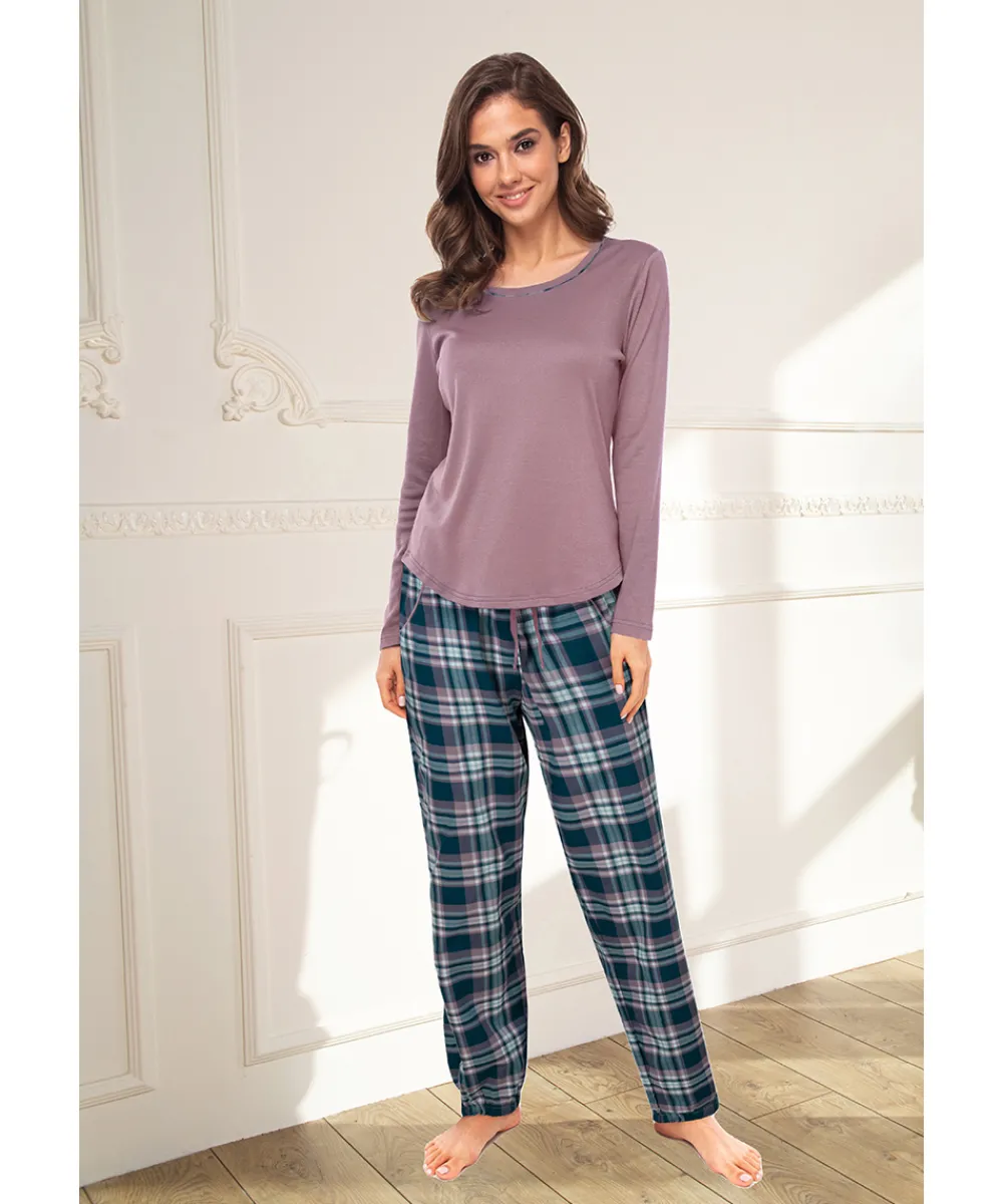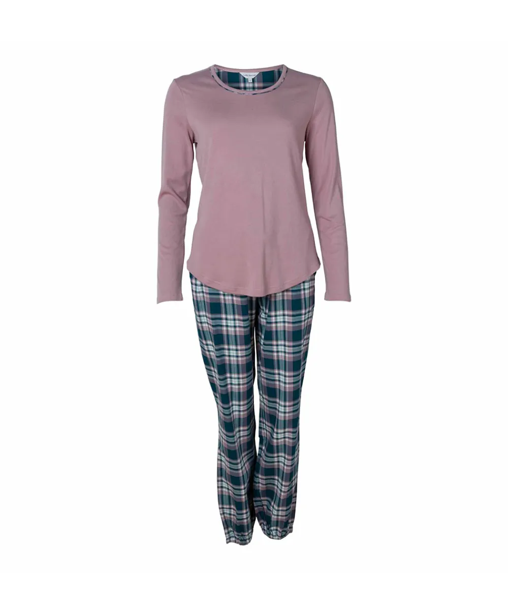 Pyjamas lavet i blødt bomuld med en afslappet pasform. Pyjamassen er todelt med en ensfarvet pyjamasbluse og ternet bukser med snørelukning i taljen. Materiale: 100% bomuld.