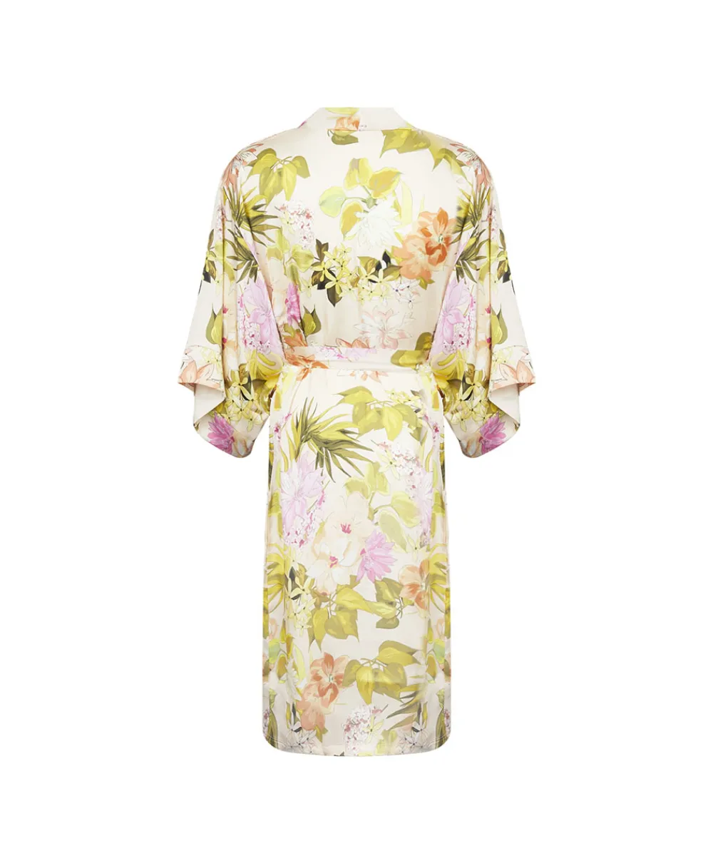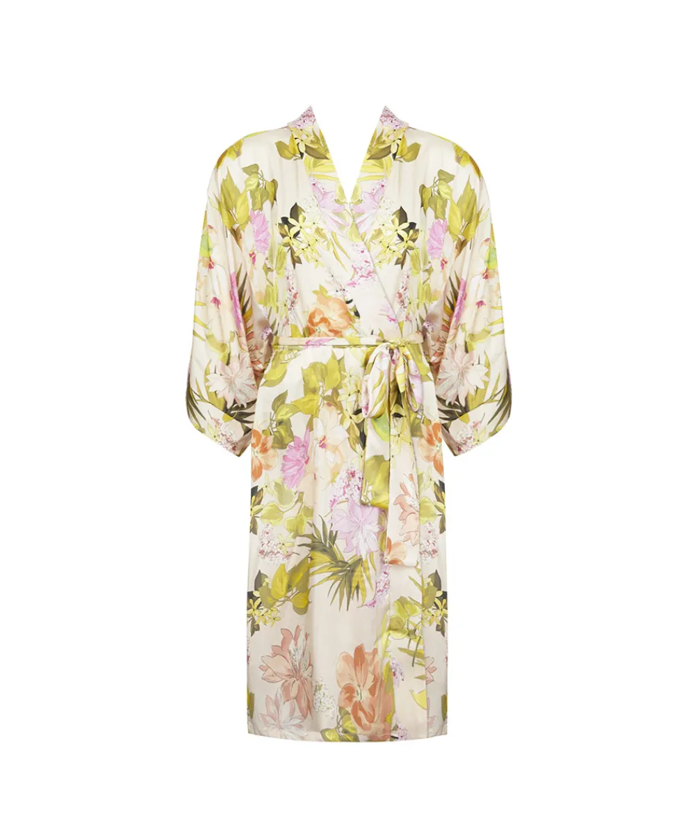 Yndig kåbe/kimono med bælte fra Lise Charmel. Kåben er designet i et yndigt print og er lavet i en blanding af viskose og silke. Silke er temperatur-regulerende, hvilket betyder at silke varmer på kolde dage og køler på varme dage. Så du kan med fordel købe nattøj eller homewear i naturlig silke, da du kan iføre dig det året rundt. Materiale: 100% viskose