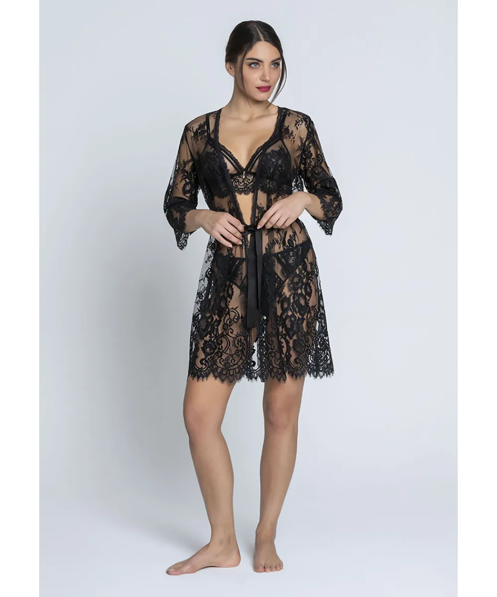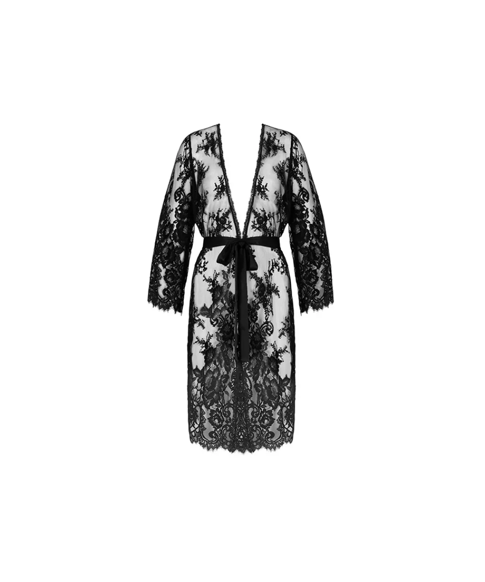 Smuk kimono i med eksklusive all-over blonde med bælte fra Lise Charmel. Brug kimonoen udover dit lingeri eller natkjole.
