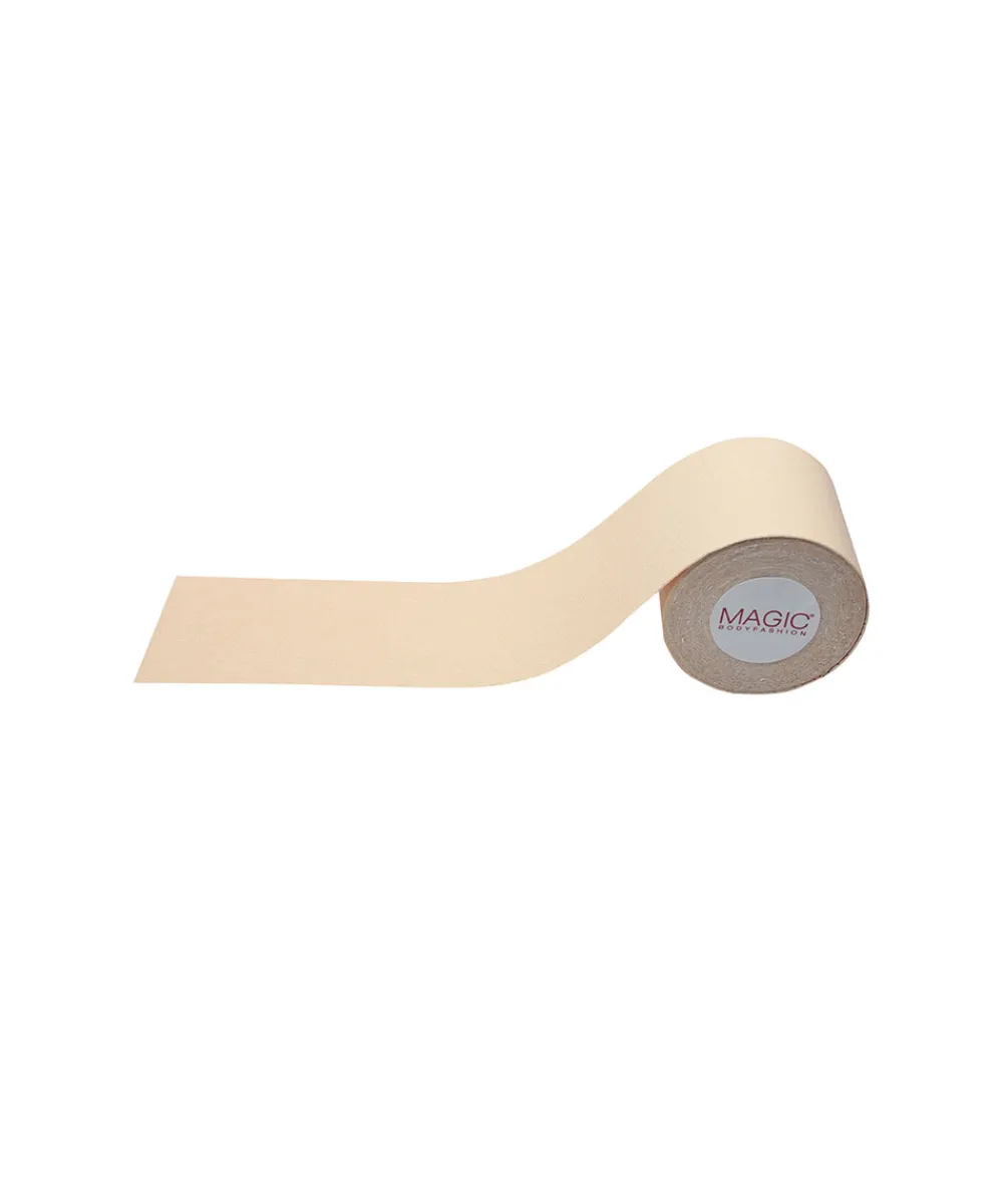 Brysttape fra Magic Bodyfashion. Brysttape kan sættes på mange forskellige måder, så det kan passe under alt slags tøj. MAGIC Bodyfashion Boob Tape giver dig mulighed for at løfte dine bryster uden at have bh på. Det er den perfekte bh-løsning til usynlig styling under ethvert rygløst, stropløst eller vovet outfit, mens du støtter dine bryster. Tapens styrke gør det nemt at klæbe til huden og har et klæbende lag, som kan dække brystvorterne uden at irritere din hud. Taperullen er 6,5 cm bred og har en samlet længde på 5 m. Du kan klippe tapen til i din ønskede længde og bruge den på mange forskellige måder, mens du skaber den perfekte spaltning og løft. Klip tapen i den ønskede længde og påfør på ren og tør hud uden creme. Brysttape er til engangsbrug og kan benyttes i op til 12 timer. Materiale: 95% bomuld, 5% elastan