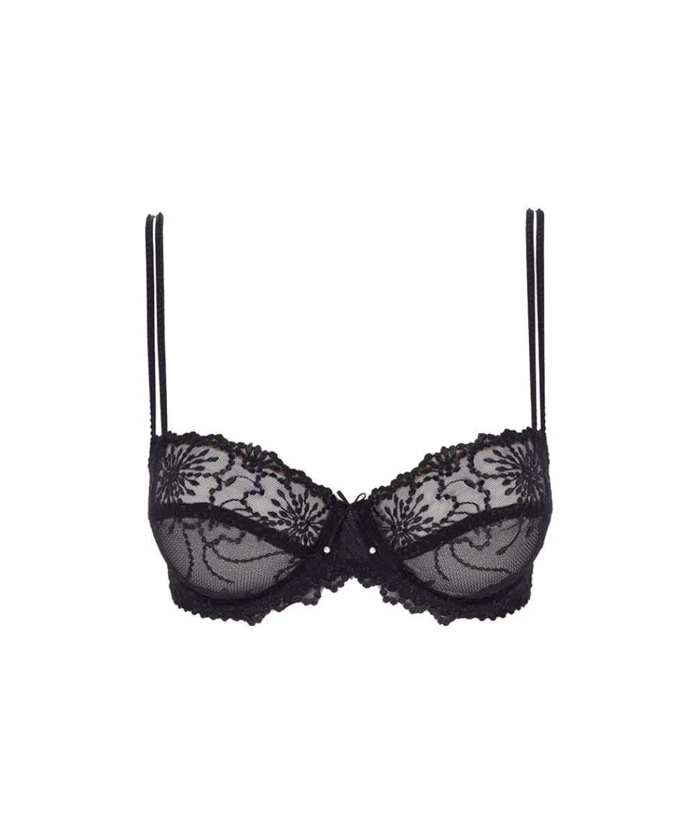 Elegant balconettebh med vandrette sømme på skålene, der giver et flatterende løft til barmen. Denne model er lavt skåret, og viser en flot kavalergang. Bh’en er designet i en blomstret blonde. De fine dobbeltstropper fuldender designet. Halvskålsbh’er kaldes ofte balconetter. Balconette bh’er har et vandret snit på skålene og dækker halvdelen af barmen. Stropperne er placeret yderst ude på skuldrene, og balconettebh’en er derfor perfekt til toppe med dybe/ vide udskæringer. Har du fylde øverst på barmen, kan du både bruge de rene blondebalconetter og de vatterede modeller. Har du derimod meget lidt fylde øverst på barmen, bør du gå efter en balconettebh med vatterede skåle eller lodrette sømme, som runder barmen. Materiale: 45% polyamid, 35% polyester, 20% elastan.