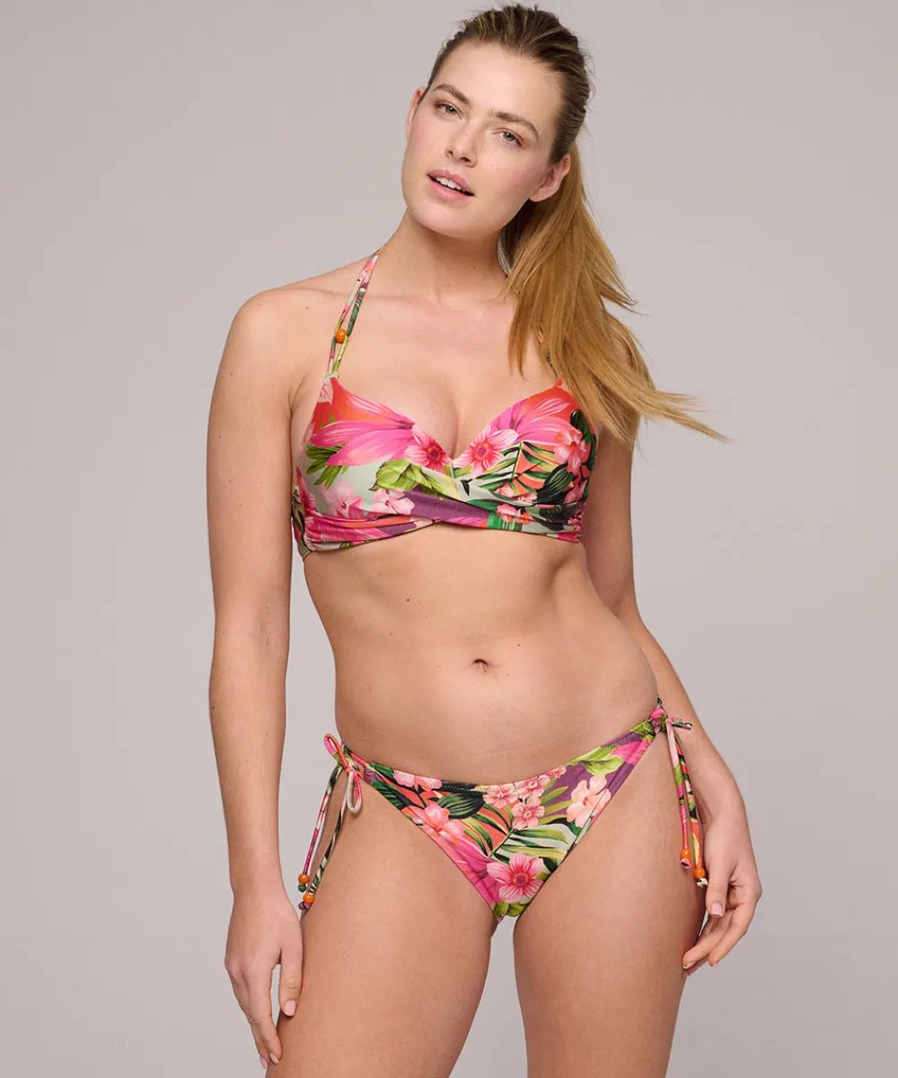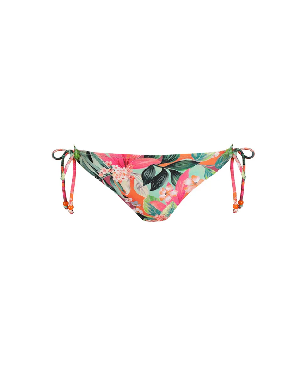 Trendy bikiniunderdel fra Marie Jo med dekorative bindebånd i siderne. Bikinitrussen er designet i farverigt mønster med yndige blomster. Bikinitrussen er lavet i en klassisk taimodel med smalle sidestykker. Badetøj skal gerne sidde stramt, da det udvider sig ved brug. Husk altid at skylle badetøjet op i koldt vand efter brug. Materiale: 51% polyamid 33% polyester 16% elastan