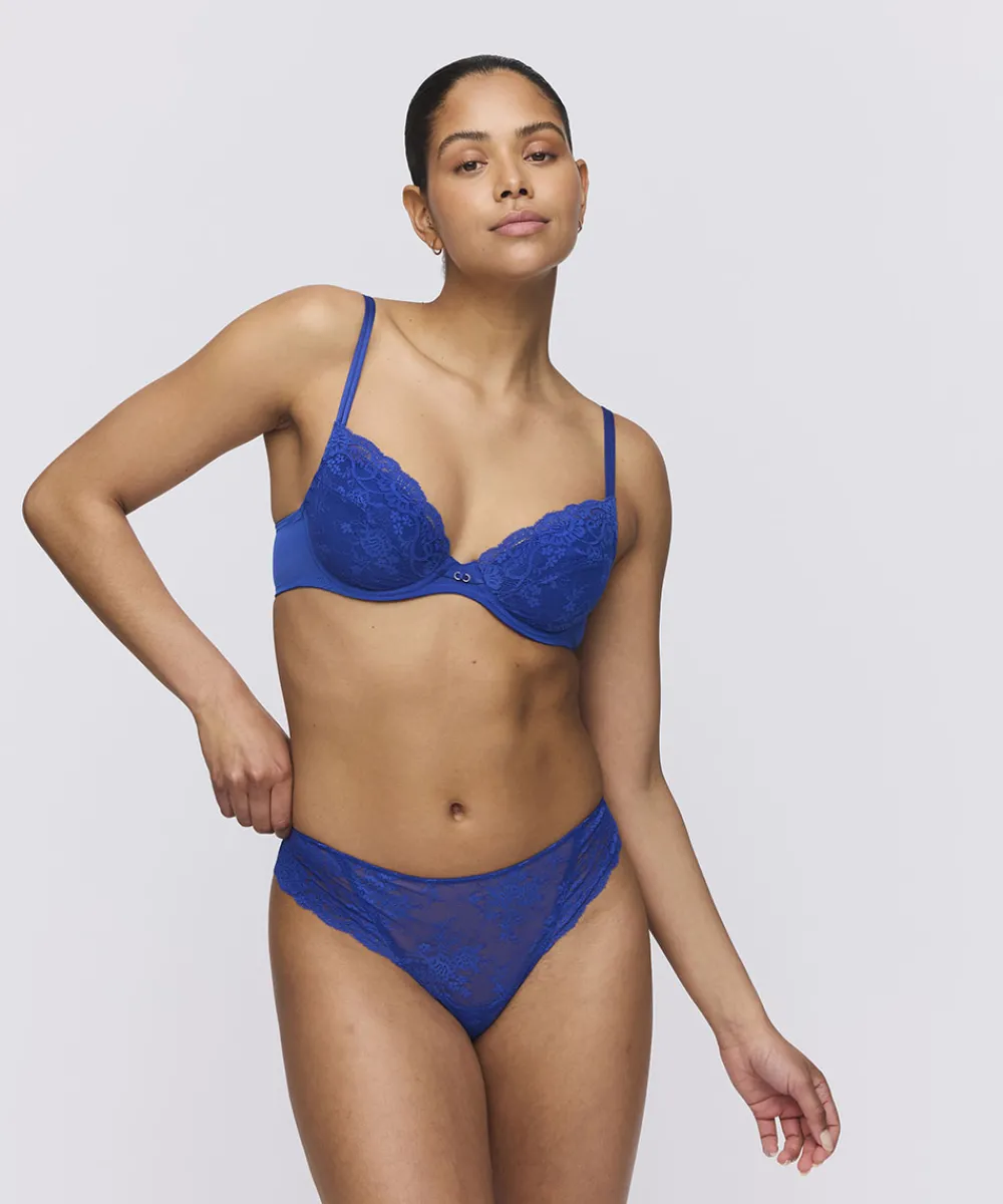 Elegant stringtrusse i en fin blomstret blonde fra Marie Jo. Trussen har ingen synlige trussekanter, og er ideel under kropsnært tøj. String og tangatrusser er særligt velegnede under tætsiddende bukser, kjoler og nederdele, da bagstykket – en tynd streng mellem balderne – ikke efterlade synlige overgange under tøjet. String og tangatrusserne har en høj benudskæring og får derfor dine ben til at syne optisk længere. Materiale: 72% polyamid, 16% bomuld, 12% elastan