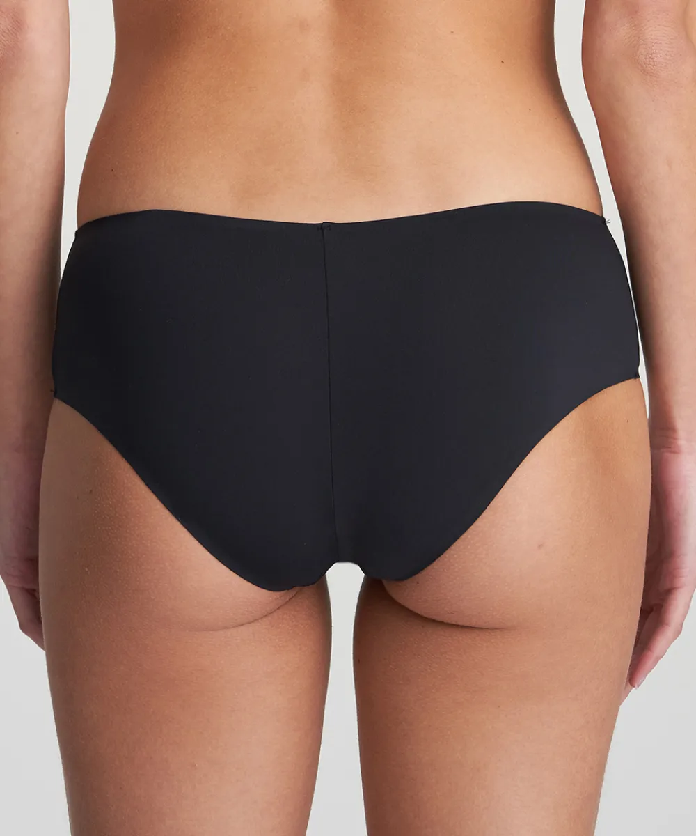 Hipstertrusse fra Marie Jo med optakt front- og bagstykke. Trussen er lavet af et meget let materiale med sømløse trussekanter, der gør den ideel under tætsiddende tøj. Meget dækkende trusse, der har en komfortabel pasform. Trussemodellerne hipster og shorts har en vandret benudskæring. Hipstertrussen går lidt op på balden og tegner et vandret snit mens shortsene dækker hele balden. Materiale: 82% polyamid, 13% elastan, 5% bomuld.