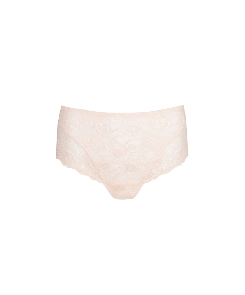 Skøn højtaljet taitrusse fra Marie Jo i en smuk all-over blonde, der er lavet af genanvendte materialer. Maxitrussen er en højtaljet trusse med bredt sidestykke og lavt bensnit. Maxitrussen dækker den nederste del af maven og passer derfor godt til tøj, der går op i taljen. Materiale: 79% polyamid, 16% elastan, 5% bomuld