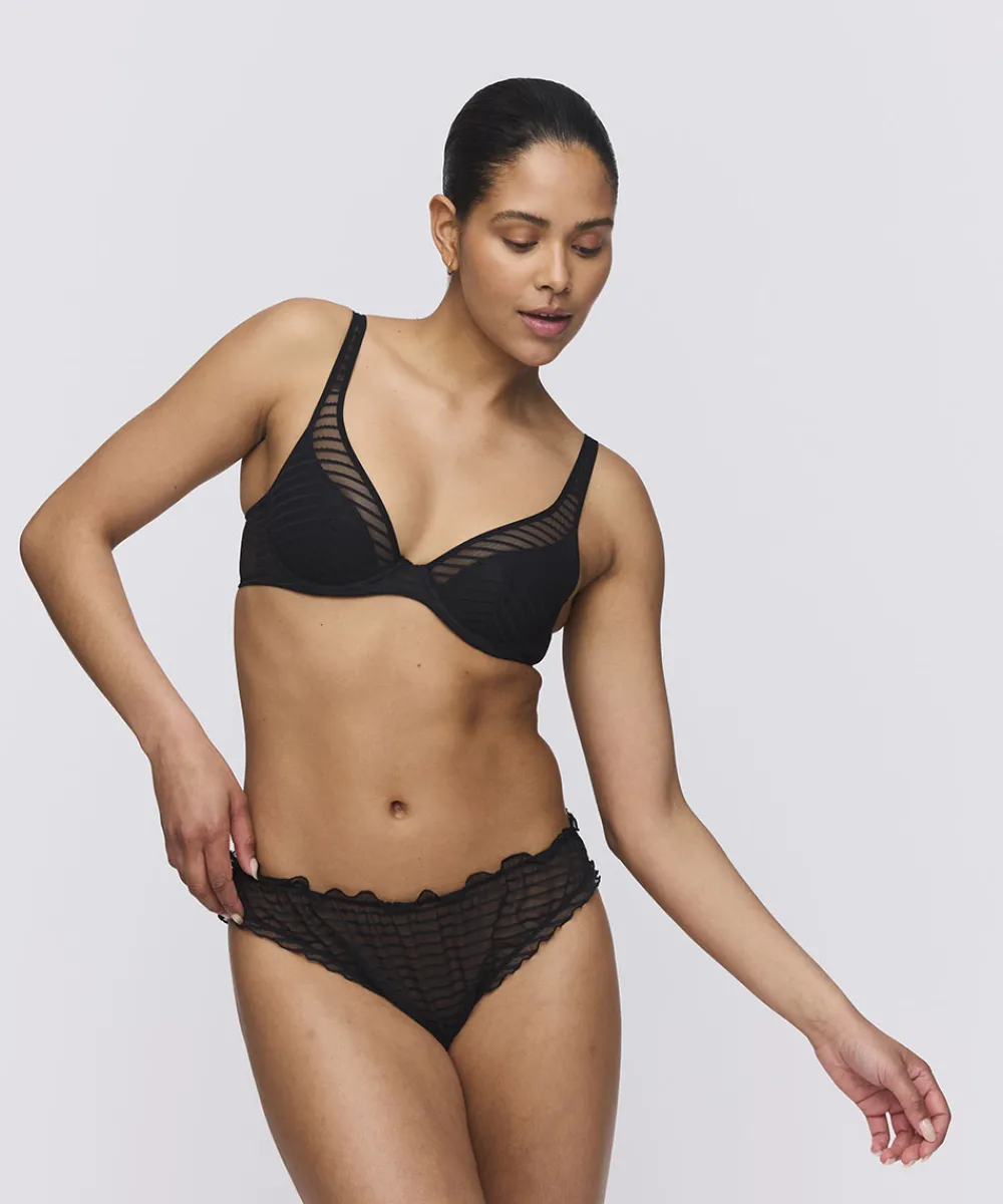 Elegant taitrusse fra Marie Jo lavet i mikrofiber med luksuriøs mesh. Taitrussen er den bedstsolgte og mest almindelige trussetype. Taitrussen har som regel et skråt snit bagpå og dækker det meste af balderne. Et højt bensnit fortil og et smalt sidestykke får benene til at syne længere – altså er modellen god til dig, der gerne vil fremhæve ben og tilføre optisk længde. Materiale: 61% polyamid 34% elastan 5% bomuld