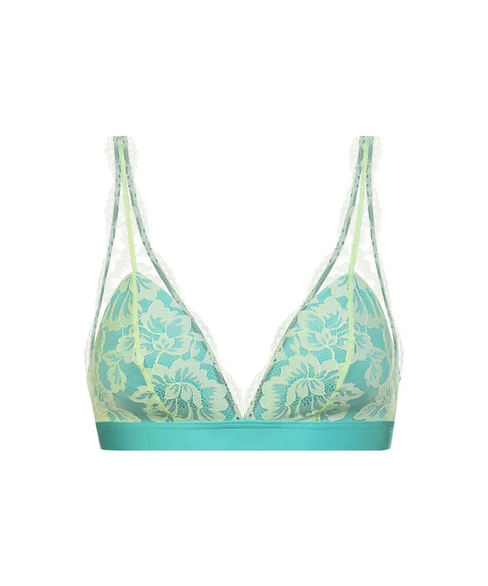 Trekantsbh i en all-over blonde fra Mey. Trekantsbh’en er uden bøjle og vattering. Bh’en har et elastisk bånd i omkredsen og stropperne er justerbare. Trekantsbh’er er er skåret skråt og tegner dermed et v-snit for til på barmen. Fordi trekantsbh’en løber skråt over barmen, kan modellen være god til kvinder med mindre fylde øverst på barmen – den skrå linje lukker skålen for oven, så den ikke så let gaber. Materiale: 87% polyamid, 13% elastan