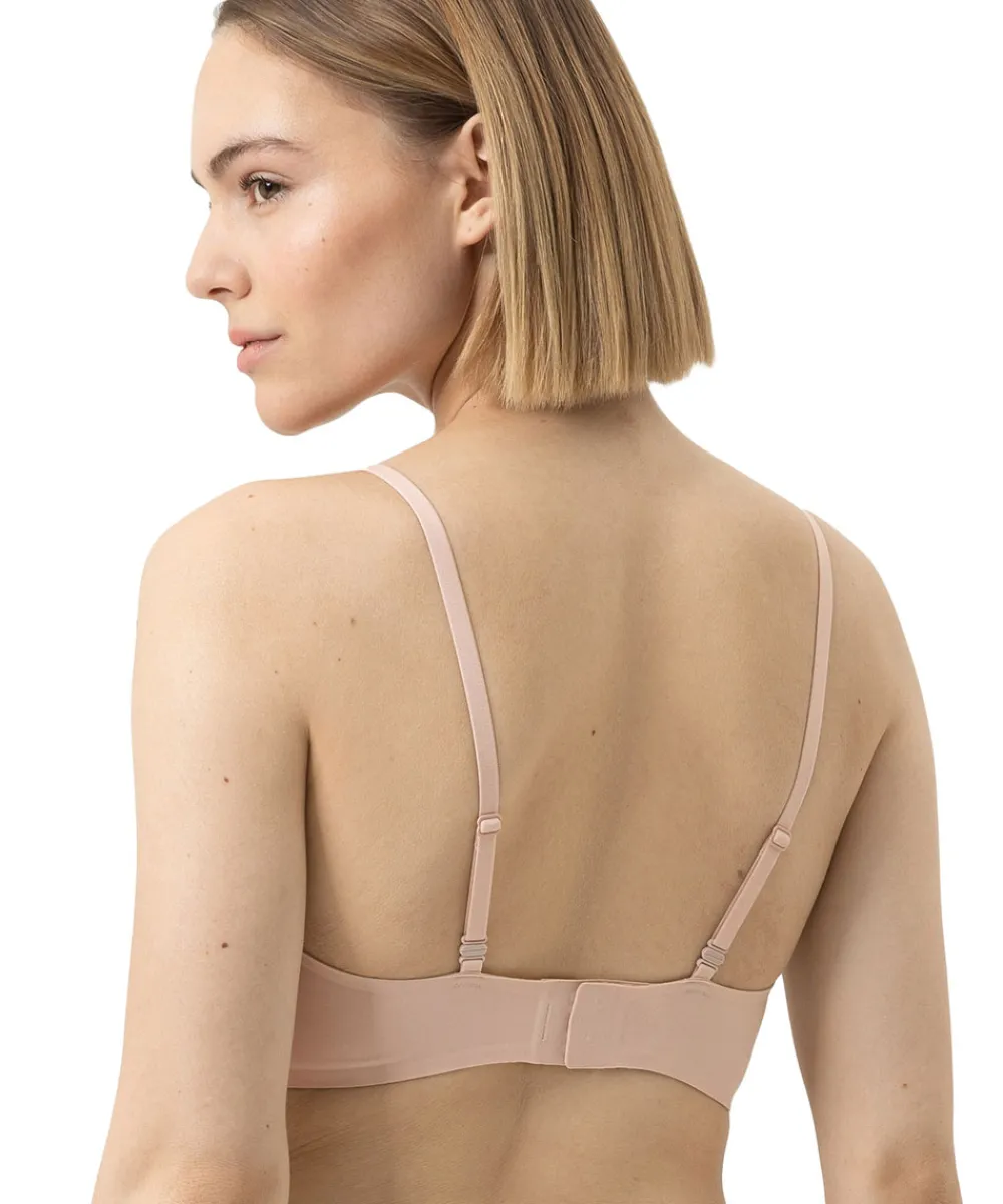 Sømløs trekantsbh fra Mey. Trekantsbh’en er uden bøjle og med let vattering. Bh’en har et elastisk bånd i omkredsen og stropperne er justerbare, samt med mulighed for at krydse dem på ryggen. Trekantsbh’er er er skåret skråt og tegner dermed et v-snit for til på barmen. Fordi trekantsbh’en løber skråt over barmen, kan modellen være god til kvinder med mindre fylde øverst på barmen – den skrå linje lukker skålen for oven, så den ikke så let gaber. Materiale: 69% polyamid, 31% elastan.