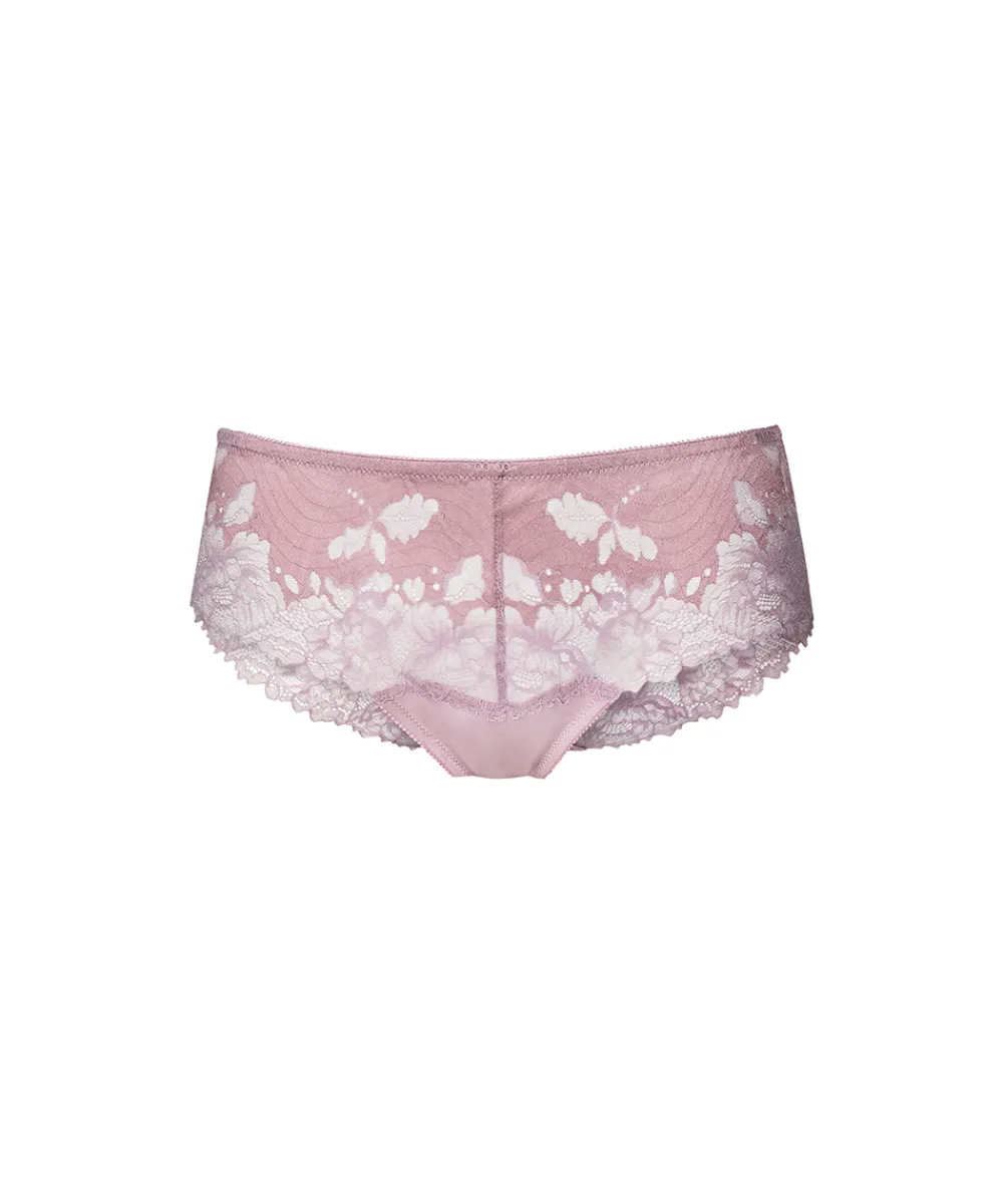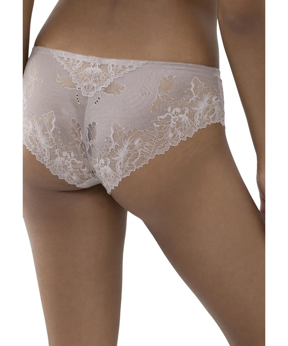 Hipstertrusse designet i en all-over blomsterblonde fra Mey. Trussemodellerne hipster og shorts har en vandret benudskæring. Hipstertrussen går lidt op på balden og tegner et vandret snit mens shortsene dækker hele balden. Materiale: 87% polyamid, 13% elastan; blonde: 60% polyamid, 31% polyester, 9% elastan.