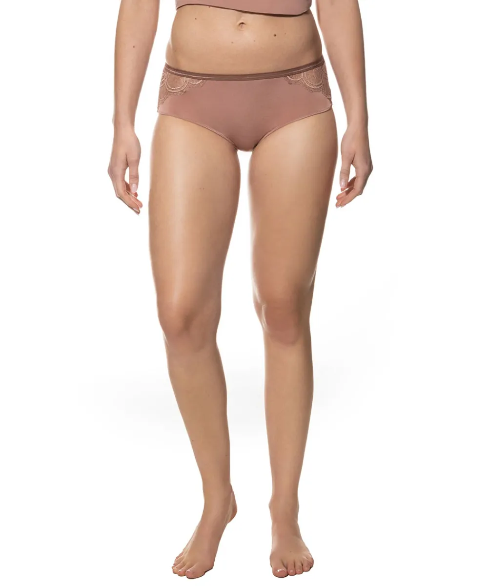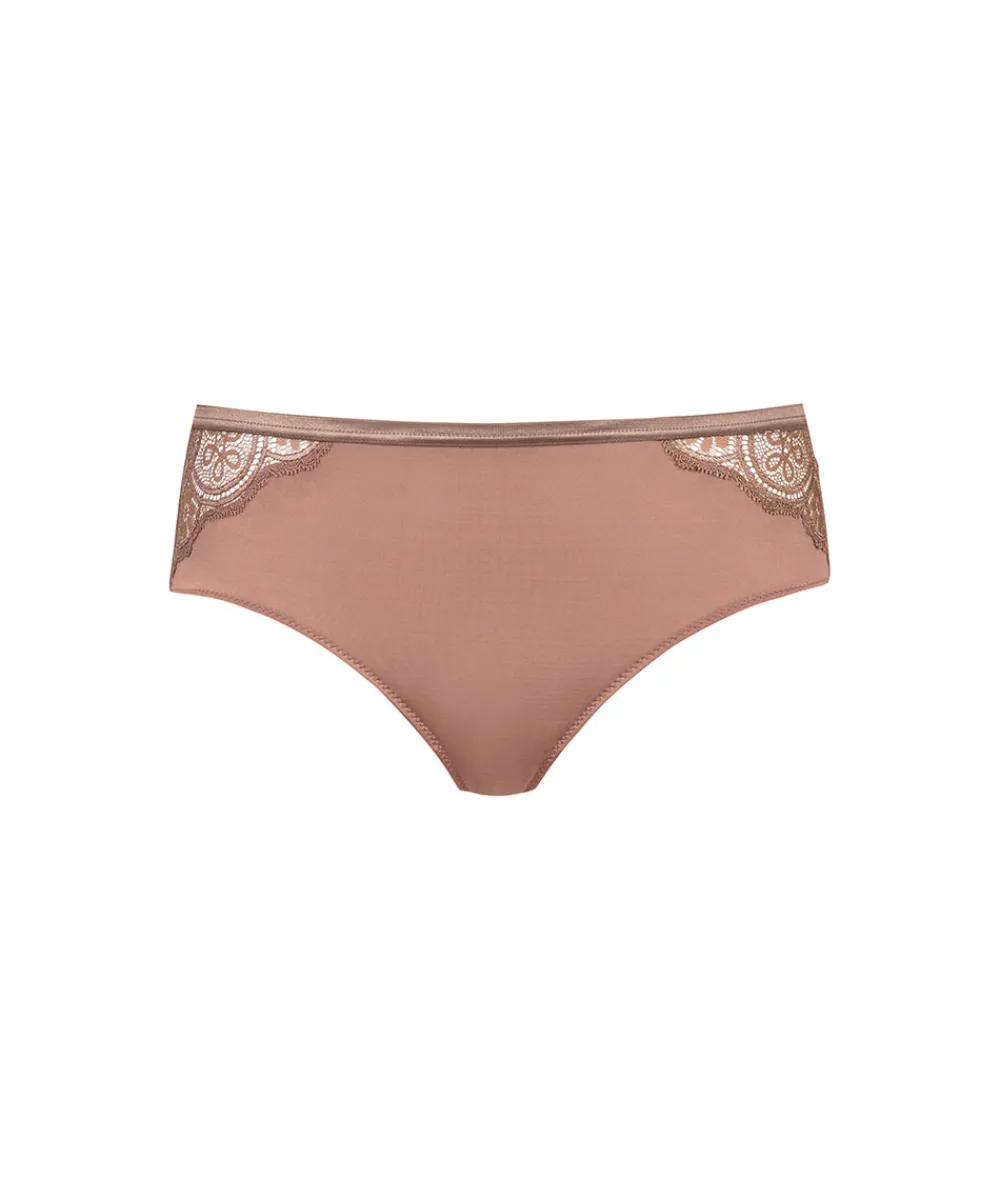 Hipster trusse med fin blomsterblonde på sidestykket. Trussen har god pasform og er lavet i et blødt, let skinende materiale. Trussemodellerne hipster og shorts har en vandret benudskæring. Hipstertrussen går lidt op på balden og tegner et vandret snit mens shortsene dækker hele balden. Materiale: 93% viskose, 7% elastan; blonde: 93% polyamid, 7% elastan; skridtkile: 100% bomuld.