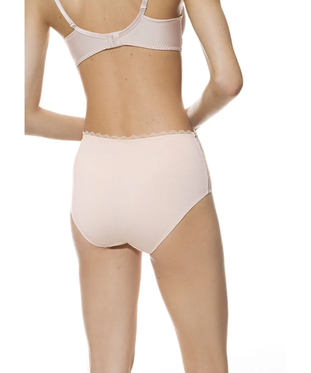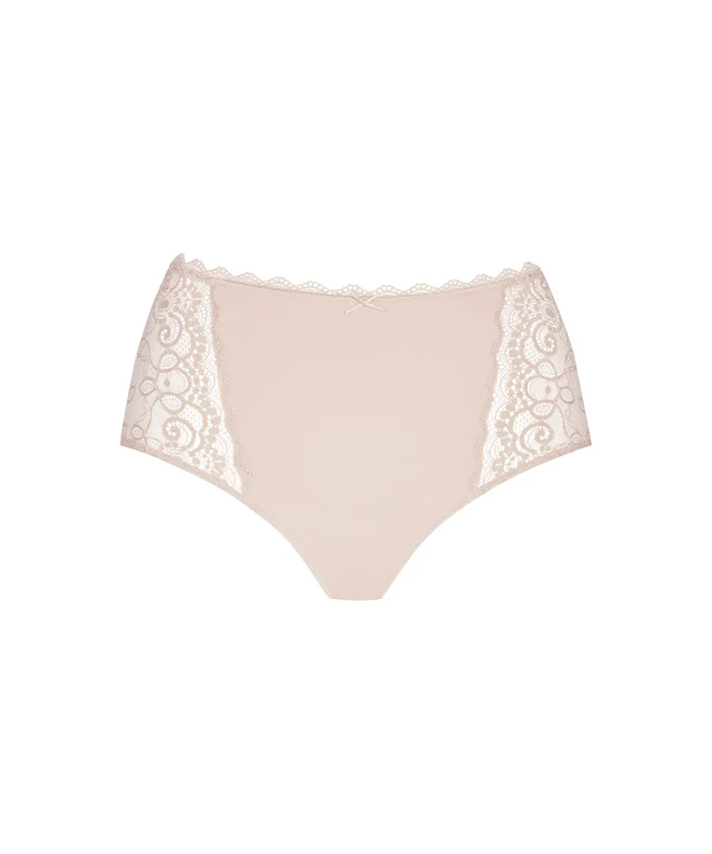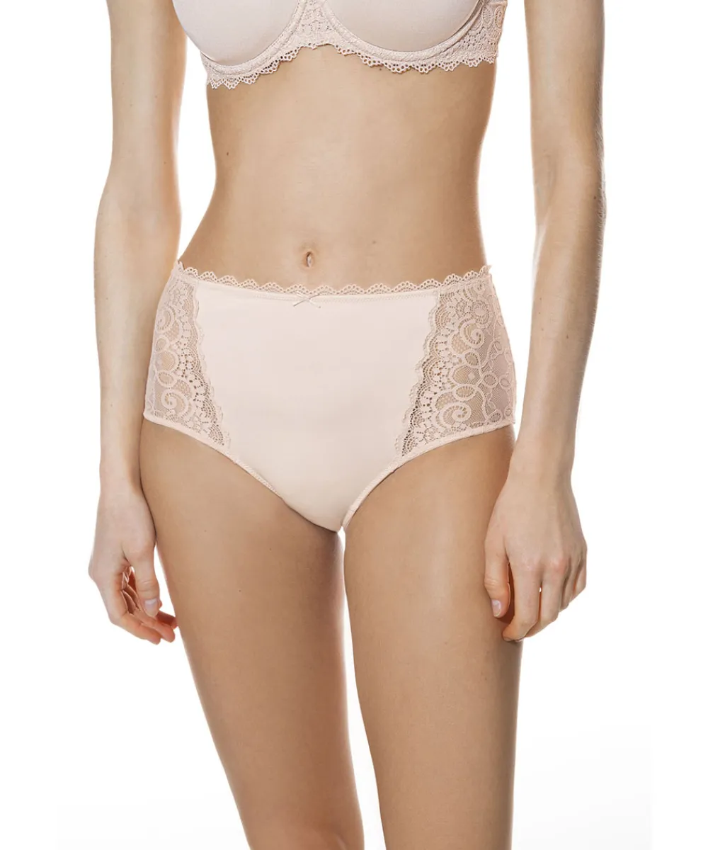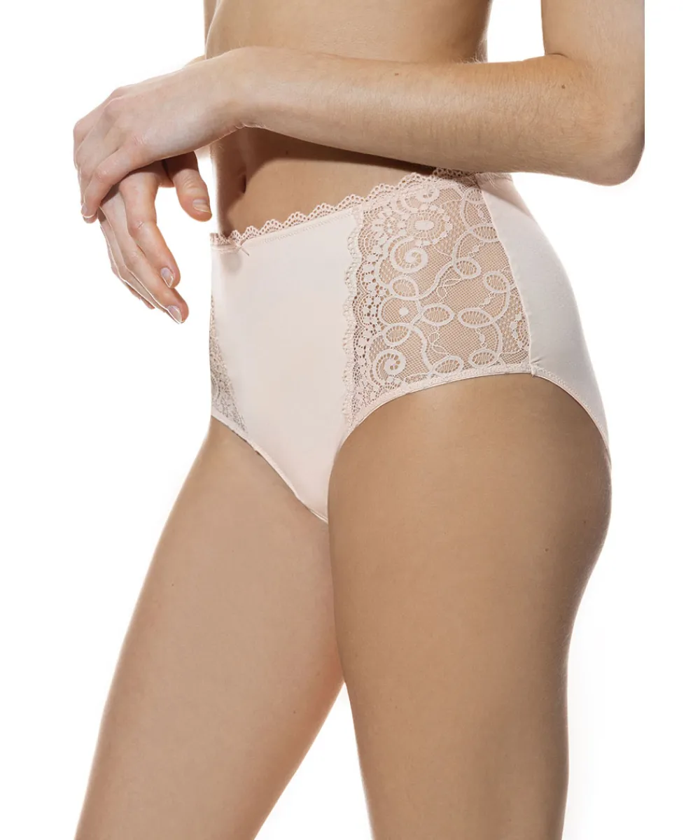 Yndige højtaljet trusse med blonde fra Mey. Maxitrussen er en højtaljet trusse med bredt sidestykke og lavt bensnit. Maxitrussen dækker den nederste del af maven og passer derfor godt til tøj, der går op i taljen. Materiale: 87% polyamid, 13% elastan; blonde: 77% polyamid, 23% elastan skridtkile: 100% bomuld.