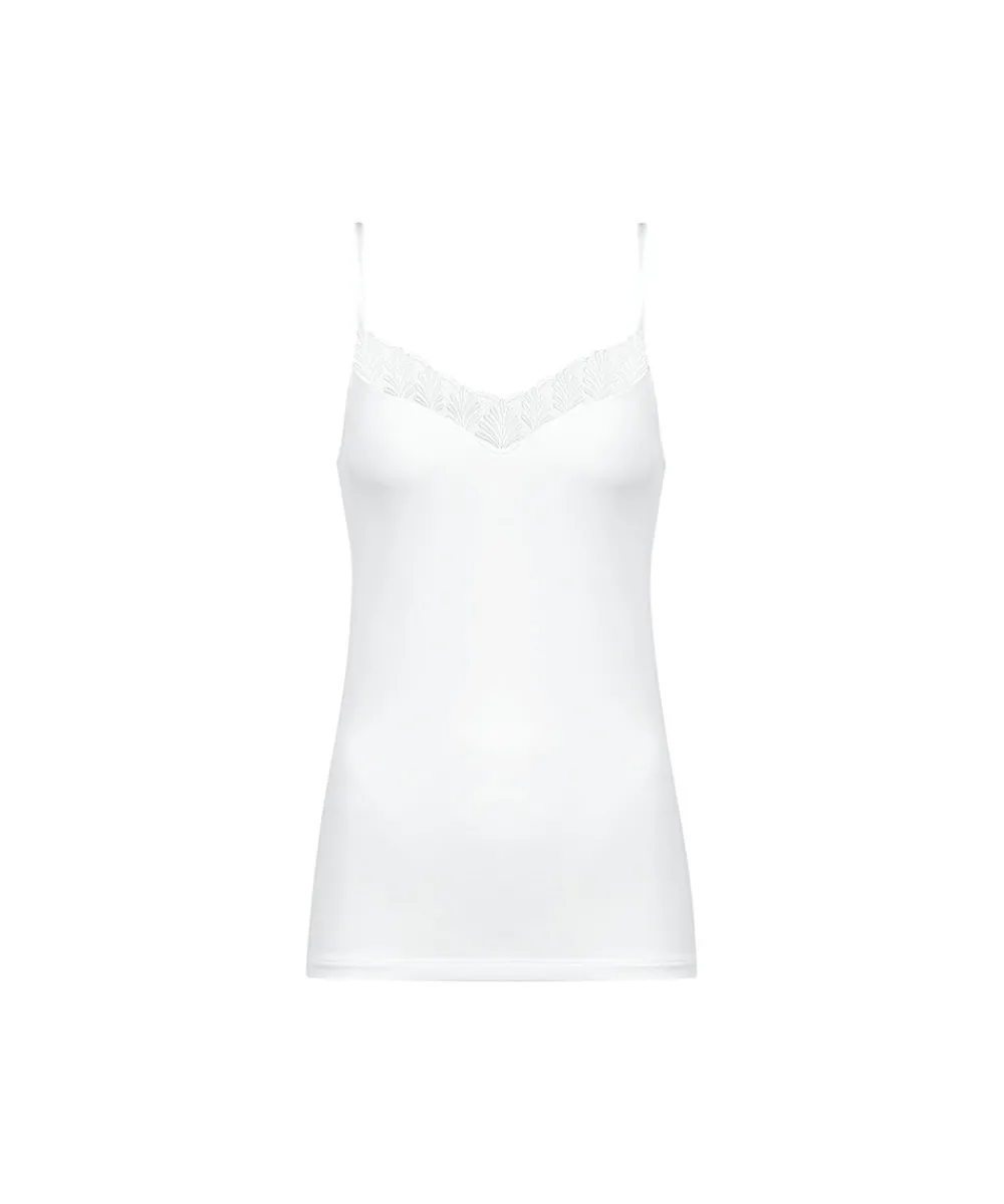 Blød top med tynde stropper, lavet i åndbare materialer fra Mey. Toppen er prydet med yndige blonder i halsudskæringen. Toppen har en slim pasform og har justerbare spaghettistropper. Topppen er designet uden sidesømme i glat stof. Materiale: 50% viskose, 46% polyamid, 4% elastan