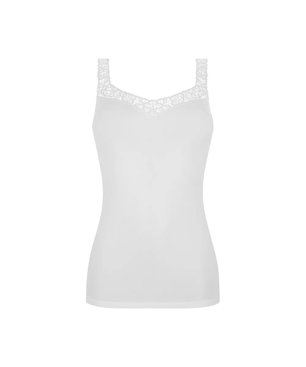 Blød top fra Mey med brede stropper, lavet i åndbare materialer. Toppen er prydet med yndige blonder i halsudskæringen som fortsætter op ad stropperne. Materiale: 50% viscose, 46% polyamid, 4% elastan.