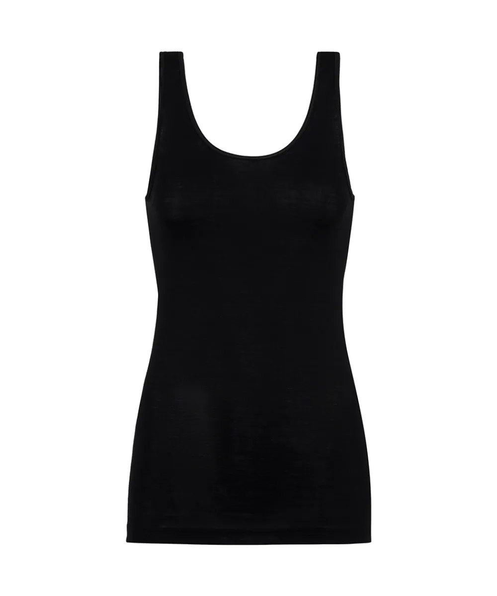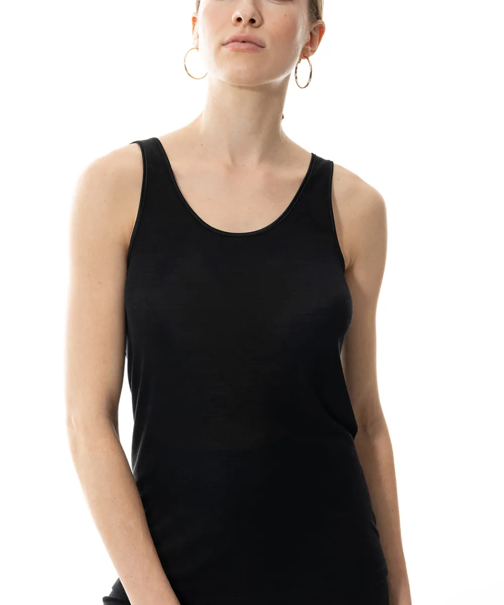 Top med brede stropper i uld og silke fra Mey. Toppen er designet med rund halsudskæring med satinkant og ingen sidesømme. Produkter der indeholder en kombination af uld og silke vil den få den egenskab, at det bliver temperatur-regulerende. Det betyder, at det kan varme på kolde dage og køle på varme dage. Materiale: 70% uld, 30% silke