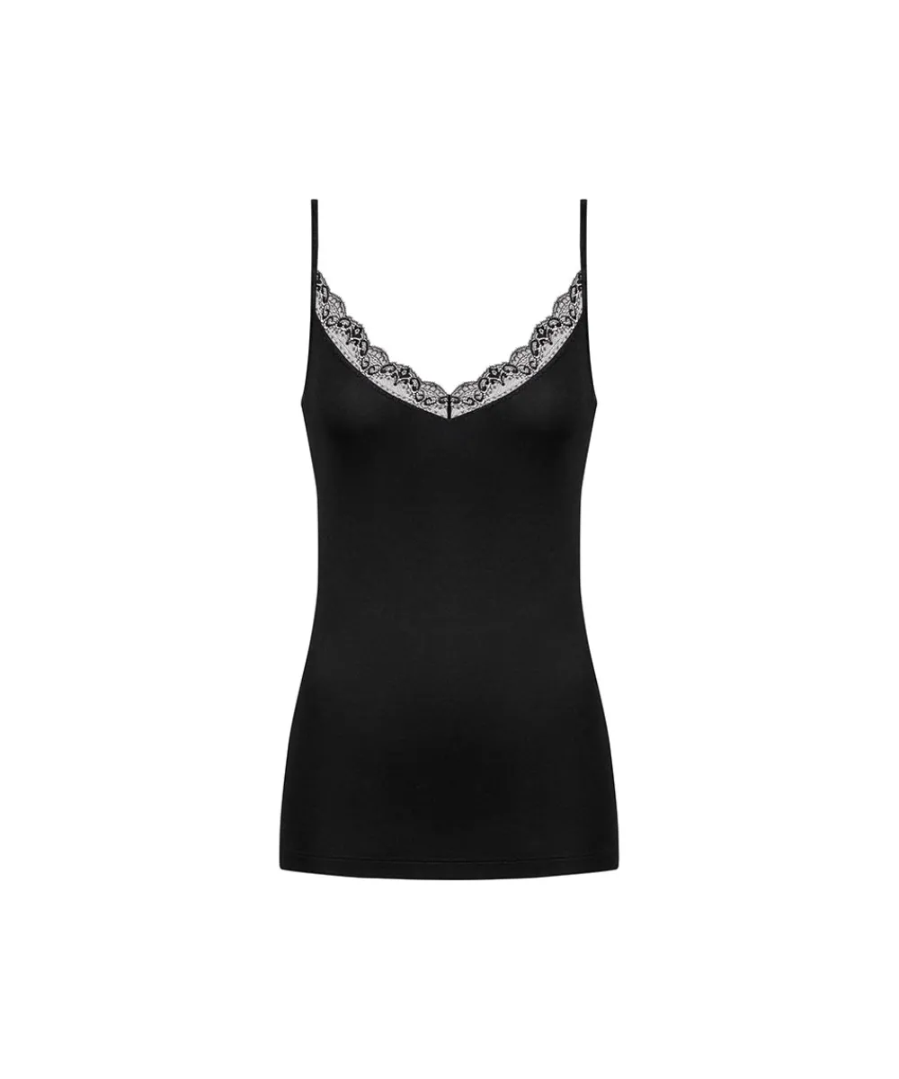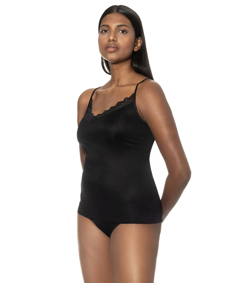 Yndig undertrøje med blondekant fra Mey. Toppen er med smalle stropper, der kan justeres. Undertrøjen har en slim pasform. Materiale: 50% viskose, 46% polyamid, 4% elastan.
