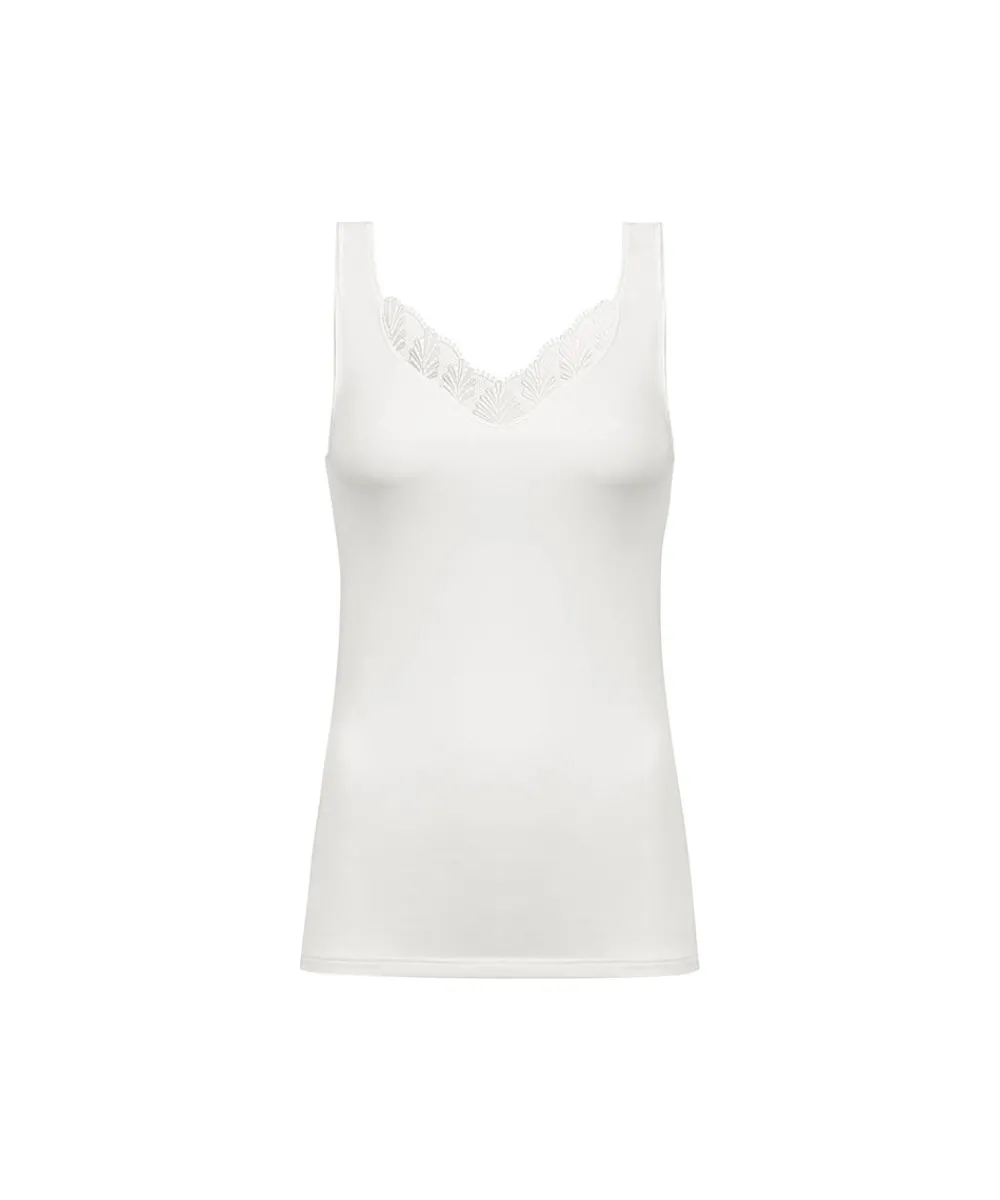 Blød top lavet i åndbare materialer fra Mey. Toppen er prydet med yndige blonder i halsudskæringen, der går ned i et V. Toppen har en slim pasform og har brede stropper. Topppen er designet uden sidesømme i glat stof. Materiale: 50% viskose, 46% polyamid, 4% elastan